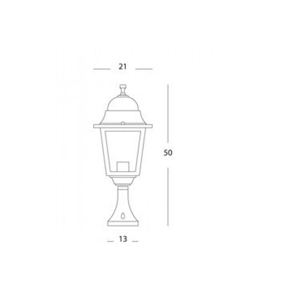 Paletto da cancello 1 luce, altezza 50 cm, realizzato con struttura in pressofusione di alluminio color nero e diffusore in vetro trasparente.. Dispositivo di connessione e triangolo di fissaggio a terra. Adatto per lampadina con altezza massima 210 mm (non inclusa).