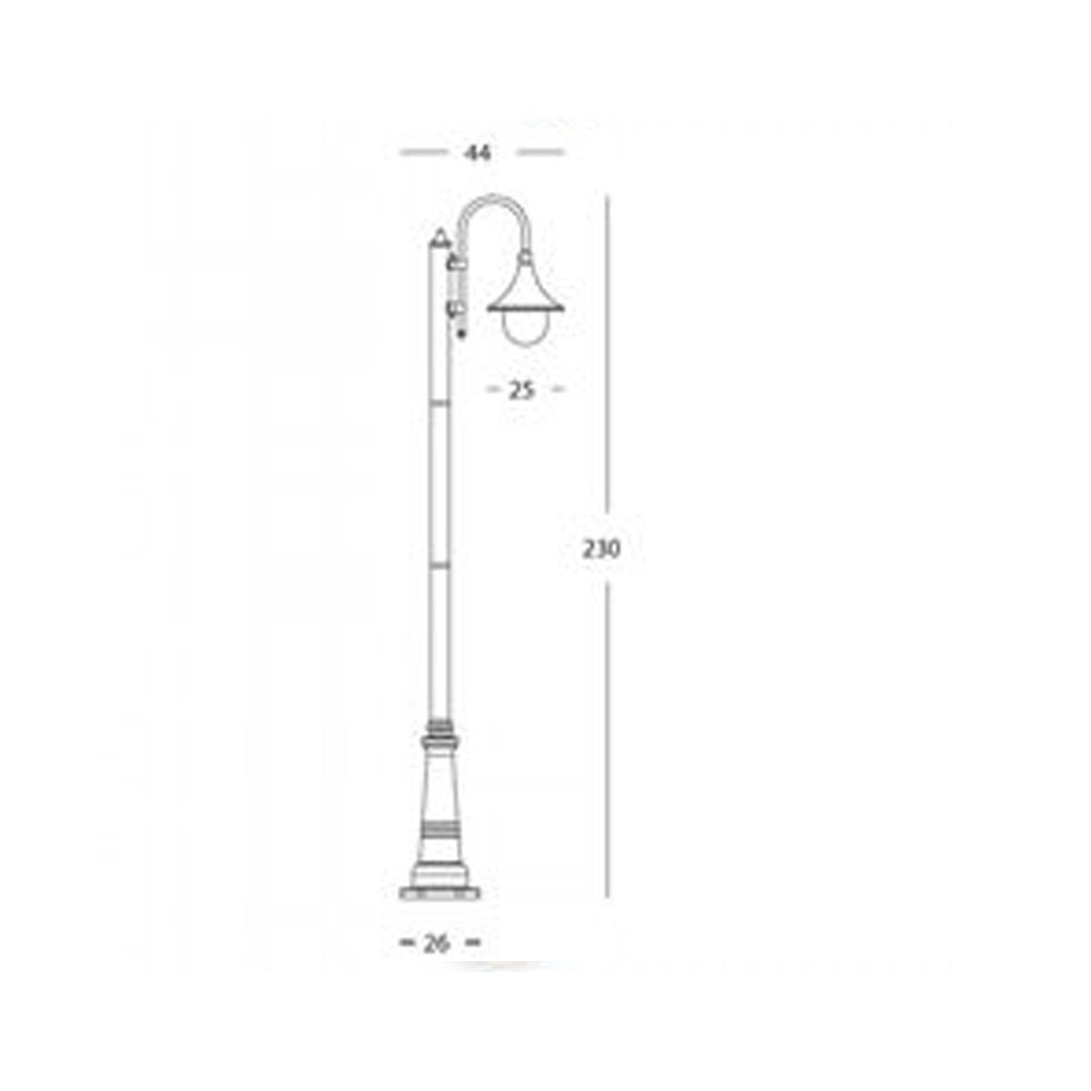 Palo 1 luce, altezza 230 cm, con struttura realizzata in pressofusione di alluminio, color nero.. Diffusore in termoplastico trasparente. Dotato di dispositivo di connessione e triangolo di fissaggio a terra. Monta lampadina (non inclusa) con altezza massima 150 mm. Disponibile anche nella versione ruggine e con altezza e luci diverse.