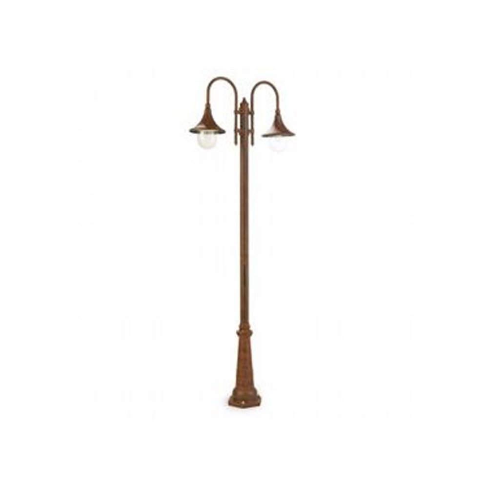 Palo a 2 luci, di altezza 230 cm, con struttura realizzata in pressofusione di alluminio, color ruggine.. Diffusori in termoplastico trasparente. Dotato di dispositivo di connessione e triangolo di fissaggio a terra. Monta lampadine (non incluse) con altezza massima 150 mm. Disponibile anche nella versione nero e con altezza e luci diverse.