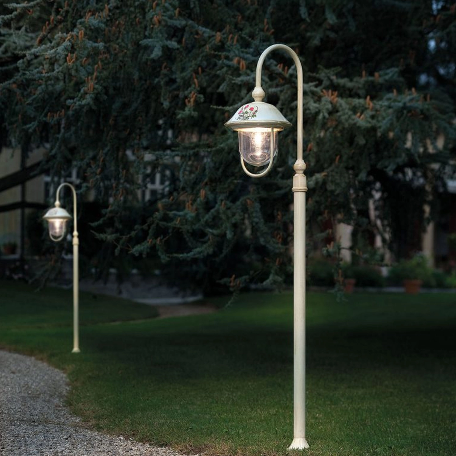 Palo da esterno 1 Luce E27 diametro 25,5 e h.157 cm in metallo e ceramica decorati con montatura bianco sfumato oro frutto di una lavorazione eseguita a mano.. La combinazione di materiali di alta qualità e artigianato superiore conferisce a questo articolo un aspetto di classe e raffinatezza. Ideale per illuminare con eleganza sale da pranzo, salotti o ambienti commerciali, diventando il punto focale dell'arredamento, catturando l'attenzione con il suo fascino senza tempo. Sia che tu stia cercando di creare un'atmosfera accogliente a casa o un ambiente di stile in un locale commerciale. E' possibile scegliere il decoro in base ai propri gusti. E' disponibile anche nei colori Argento, Bianco, Bianco Sfumato Argento,Bianco Sfumato Oro, Nero, Nero Sfumato Argento, Nero Sfumato Oro, Nero Sfumato Rame, Ruggine, Verde Sfumato Oro, Ottone Brunito.
