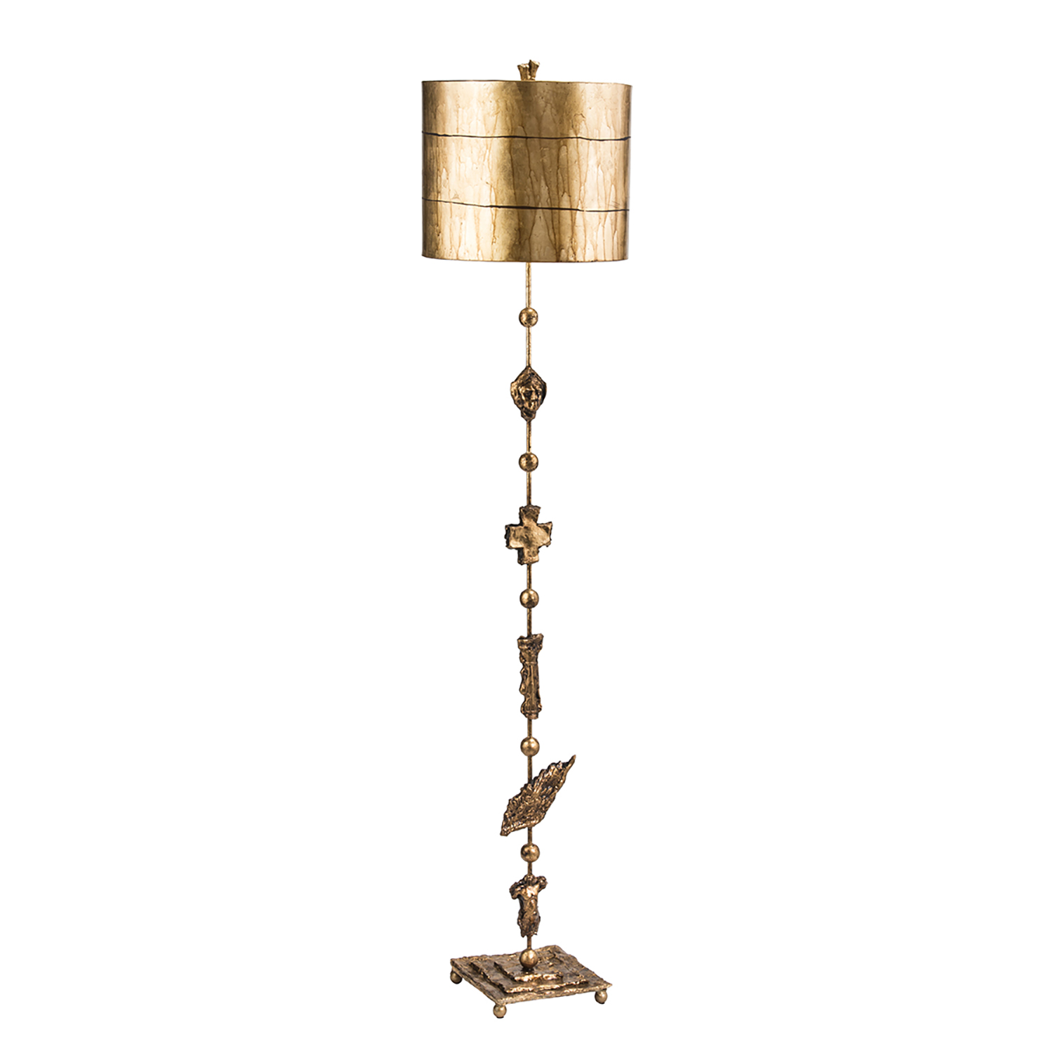 Lampada da terra a 1 luce - Oro. La famiglia Fragment porta un tocco di antico nello stile moderno. Il designer Paul Gruer, influenzato dal mercato francese di New Orleans, ha raccolto tesori unici e li ha combinati con semplici paralumi a tamburo. Ogni prodotto è dipinto a mano con foglia d'oro o d'argento e smaltato per mostrare il suo fascino artistico.