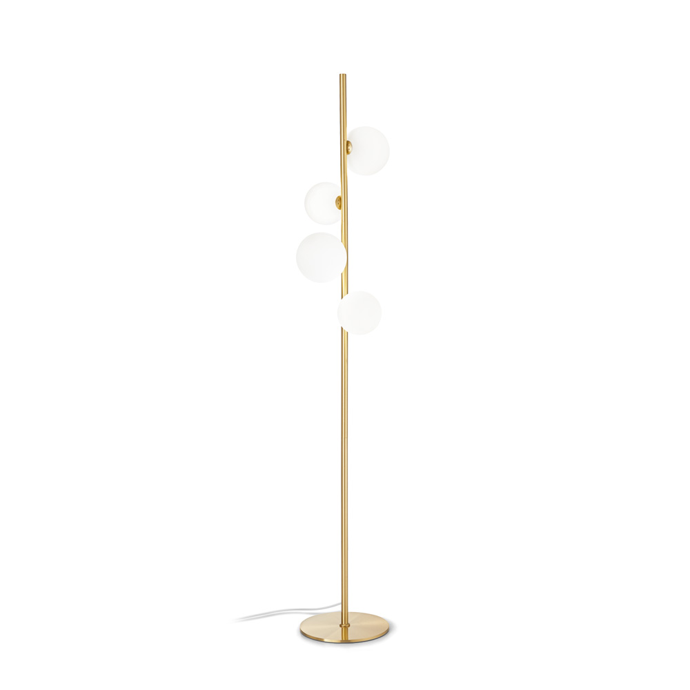 Lampada da terra moderna a 4 luci moderna montatura in metallo ottone satinato con struttra lineare a sezione tonda. Diffusori in vetro soffiato bianco..