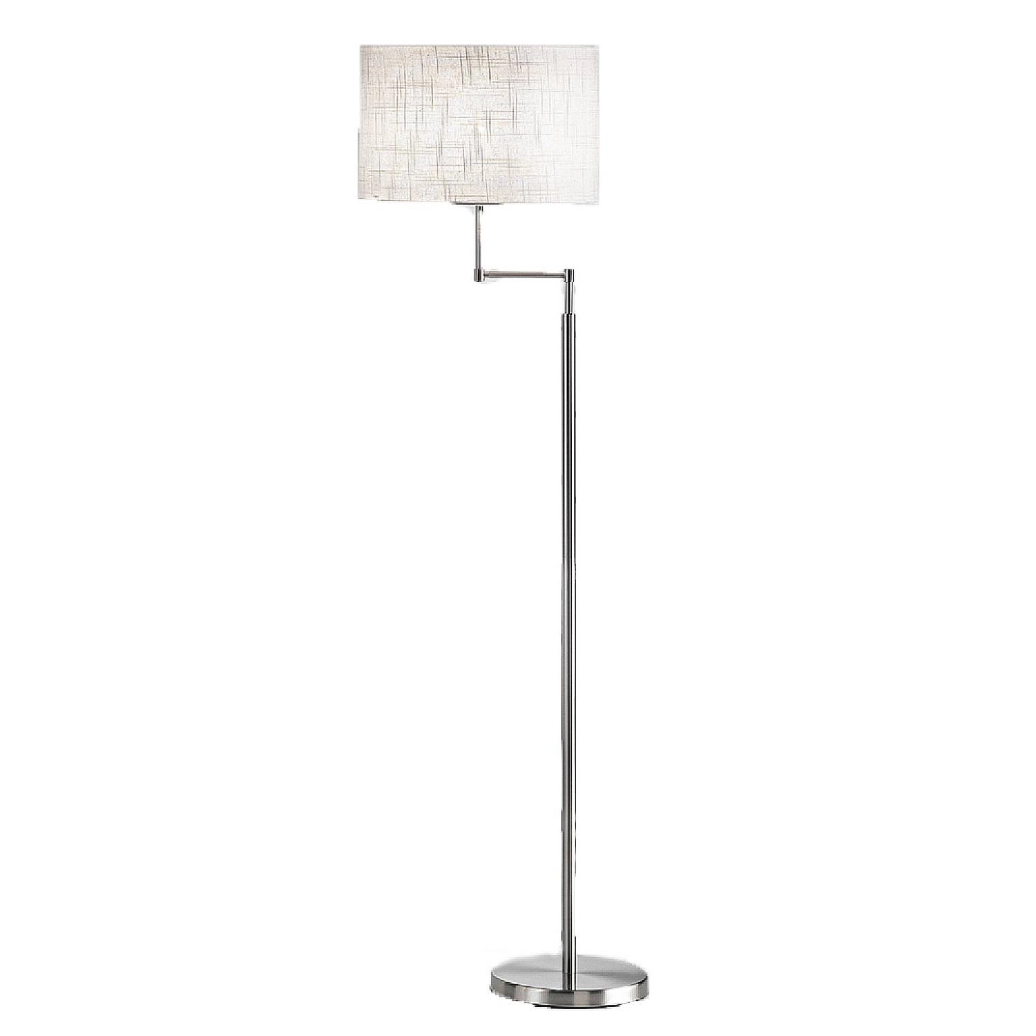 Piantana realizzata in metallo cromato spazzolato, mentre il paralume è in tessuto bianco, che diffonde la luce in modo uniforme e morbido. Caratterizzata da un design elegante e moderno, che la rende adatta a diversi contesti d'arredo. Grazie alla sua forma circolare, questa applique si adatta perfettamente a qualsiasi ambiente, sia classico che contemporaneo.
