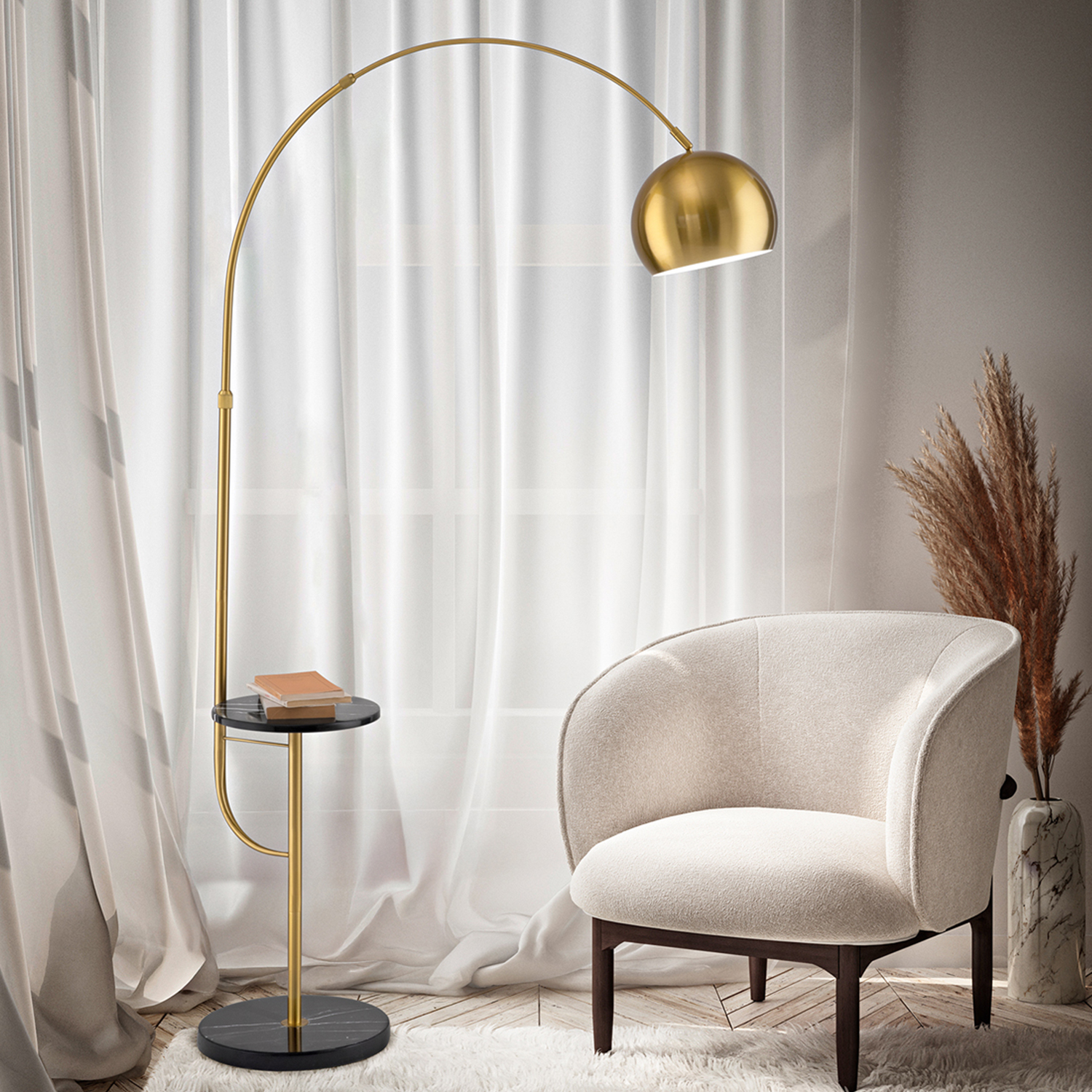 Collezione con struttura in metallo e alluminio ottone brunito. Paralume in metallo. Base e tavolo da appoggio in marmo nero. Colore: ottone brunito Base D.35 x H.192 cm Paralume D.25 cm 1 x E27 MAX 60W 220-240V 50/60Hz IP20 - Classe II H. regolabile Interruttore on/off a pedale