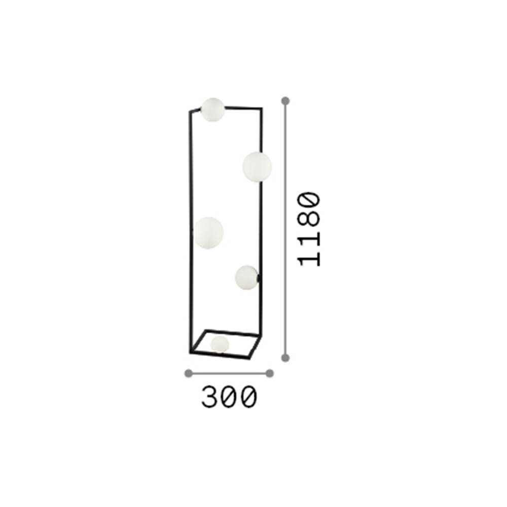 Piantana 5 luci contemporanea con montatura in metallo verniciato nero.. Elementi diffusori in vetro bianco soffiato e acidato con cavo in PVC nero con interruttore e spina.
