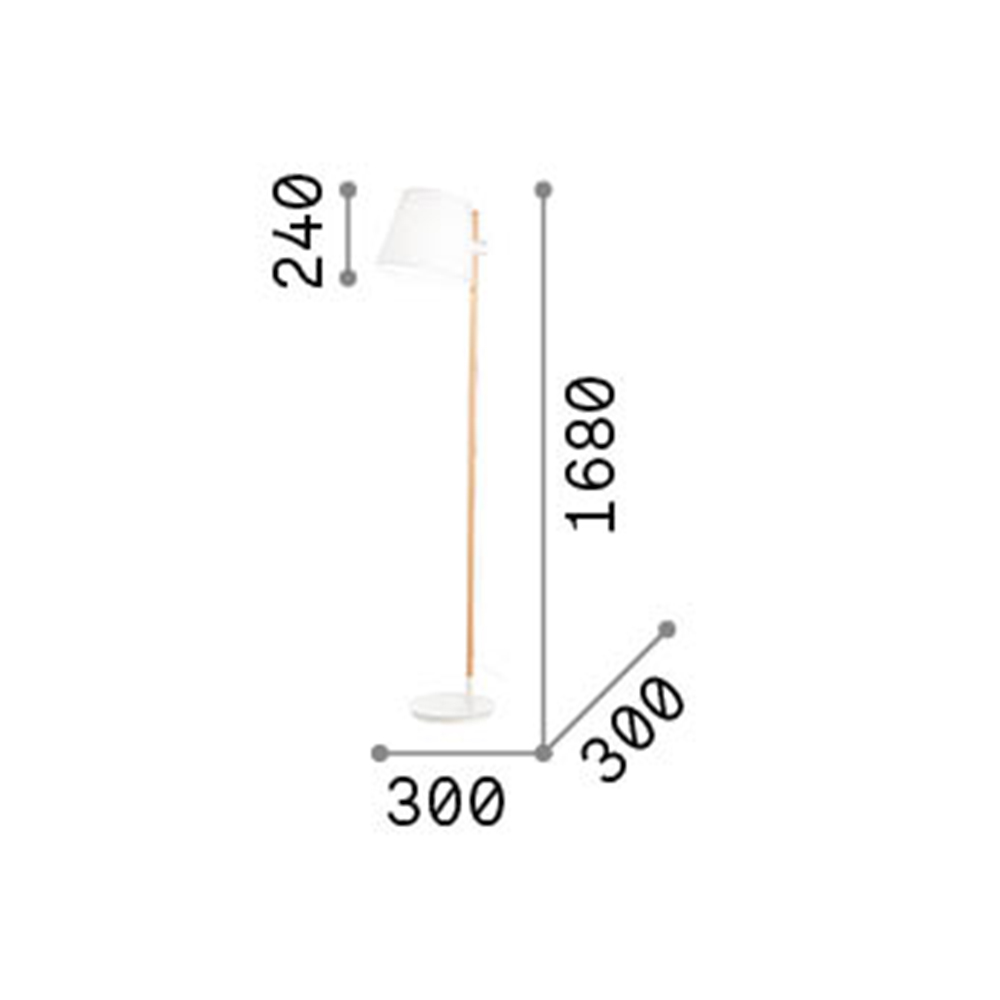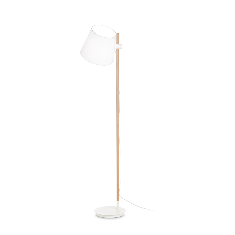 Lampada da terra con base e raccordi in metallo verniciati a polvere bianco, stelo in legno naturale e paralume in pvc rivestito di tessuto bianco.. Il paralume è regolabile in altezza, mentre il cavo in pvc è dotato di interruttore integrato ON/OFF.