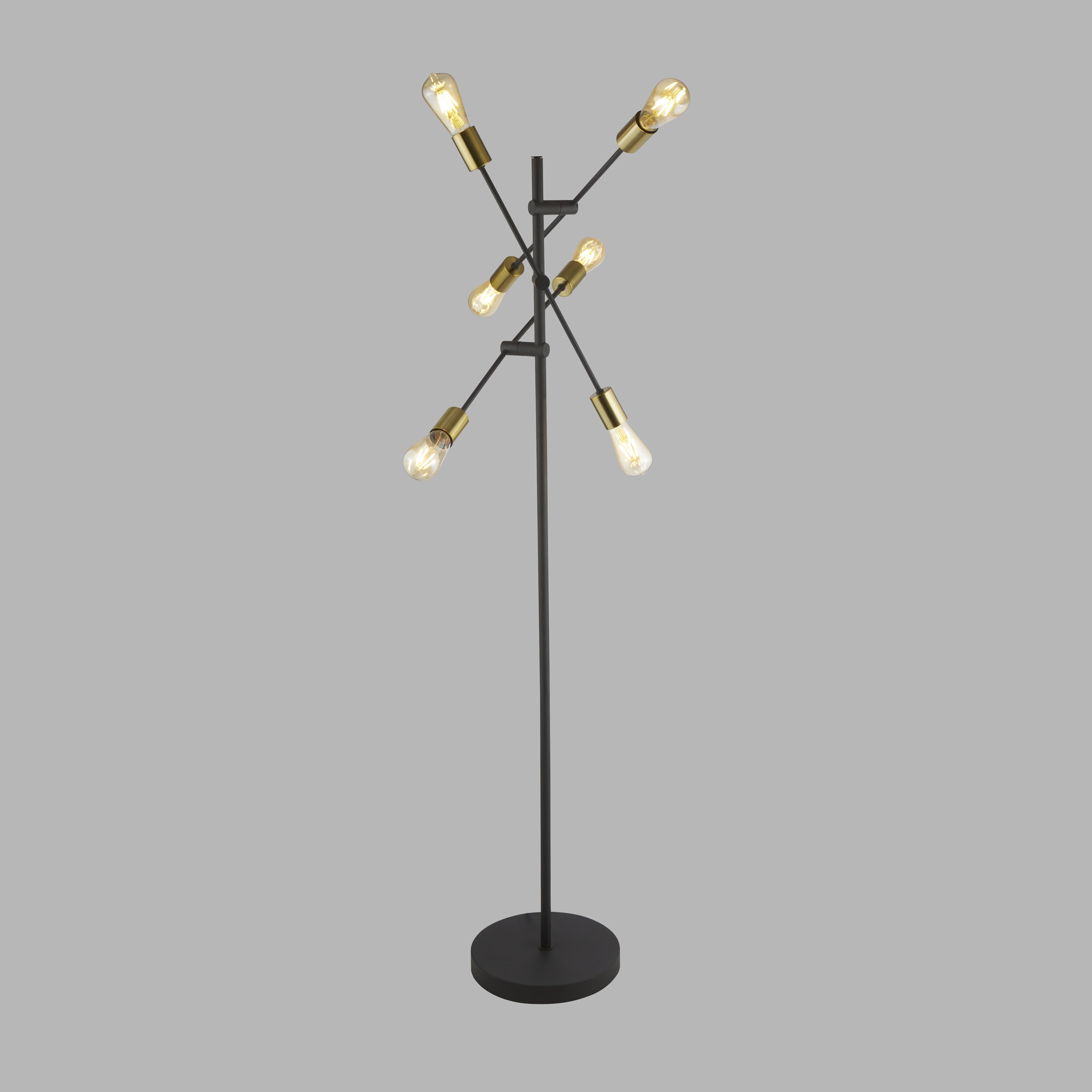 La lampada da terra Armstrong a 6 luci ultra moderna e accattivante si adatta perfettamente a una casa moderna. La finitura nera opaca è completata dalle lampade retrò a vista in ottone satinato, posiziona questa lampada da terra in un ampio corridoio o soggiorno per creare un impatto eterno.