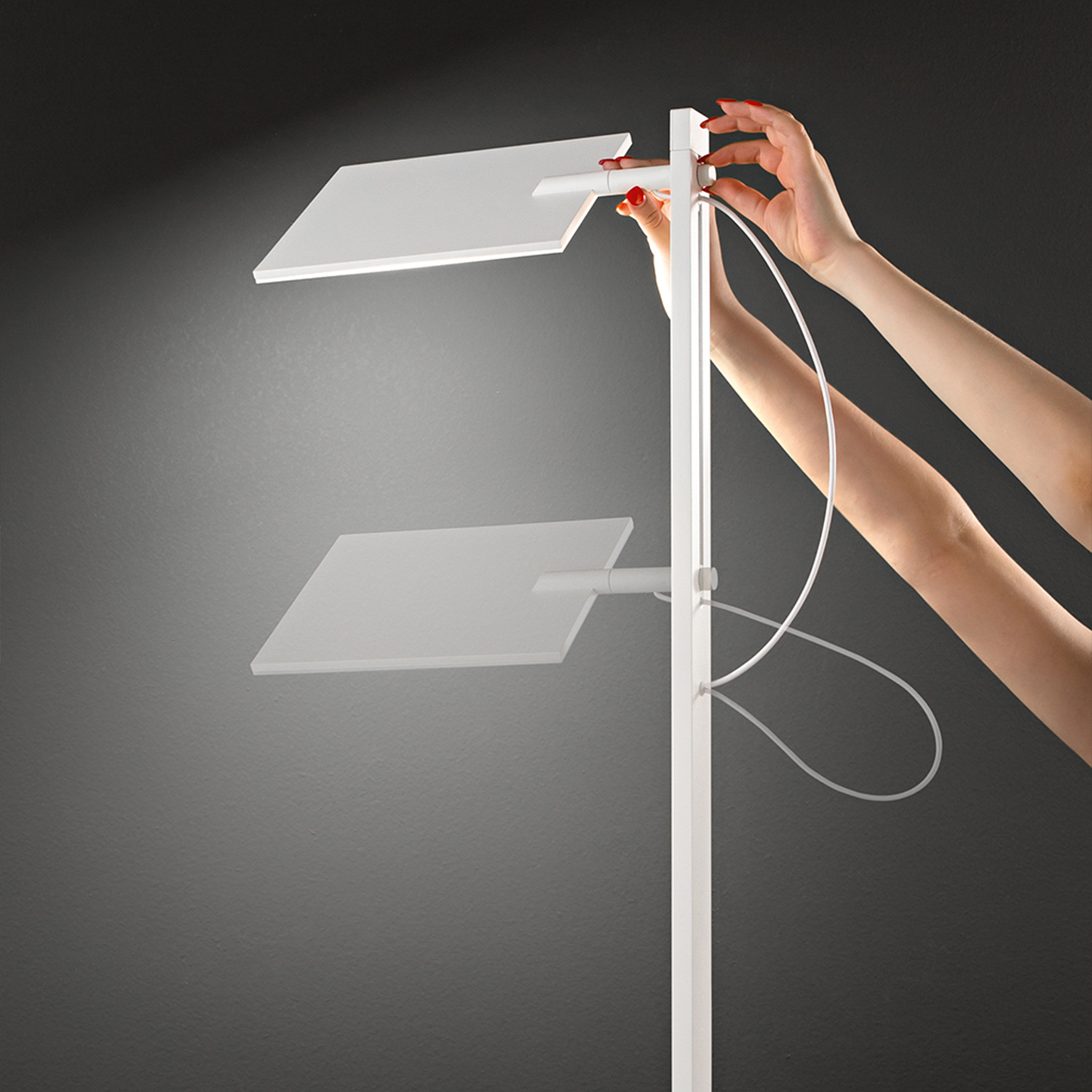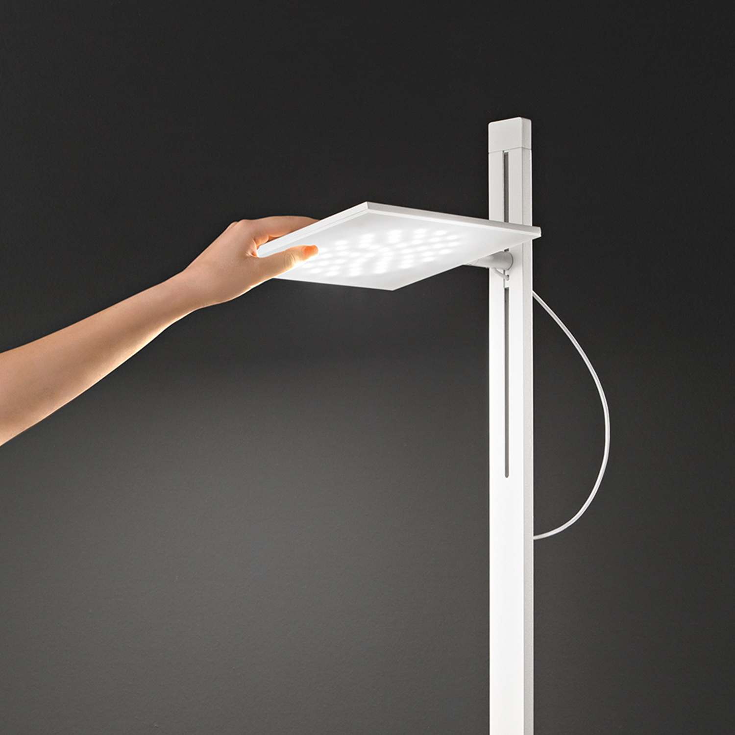 Piantana con struttura in metallo e alluminio verniciato a polvere. Testina regolabile in altezza e orientabile a 340°. DiFFusore in acrilico satinato. Interruttore ON/OFF. CCT e dimmer a pedale