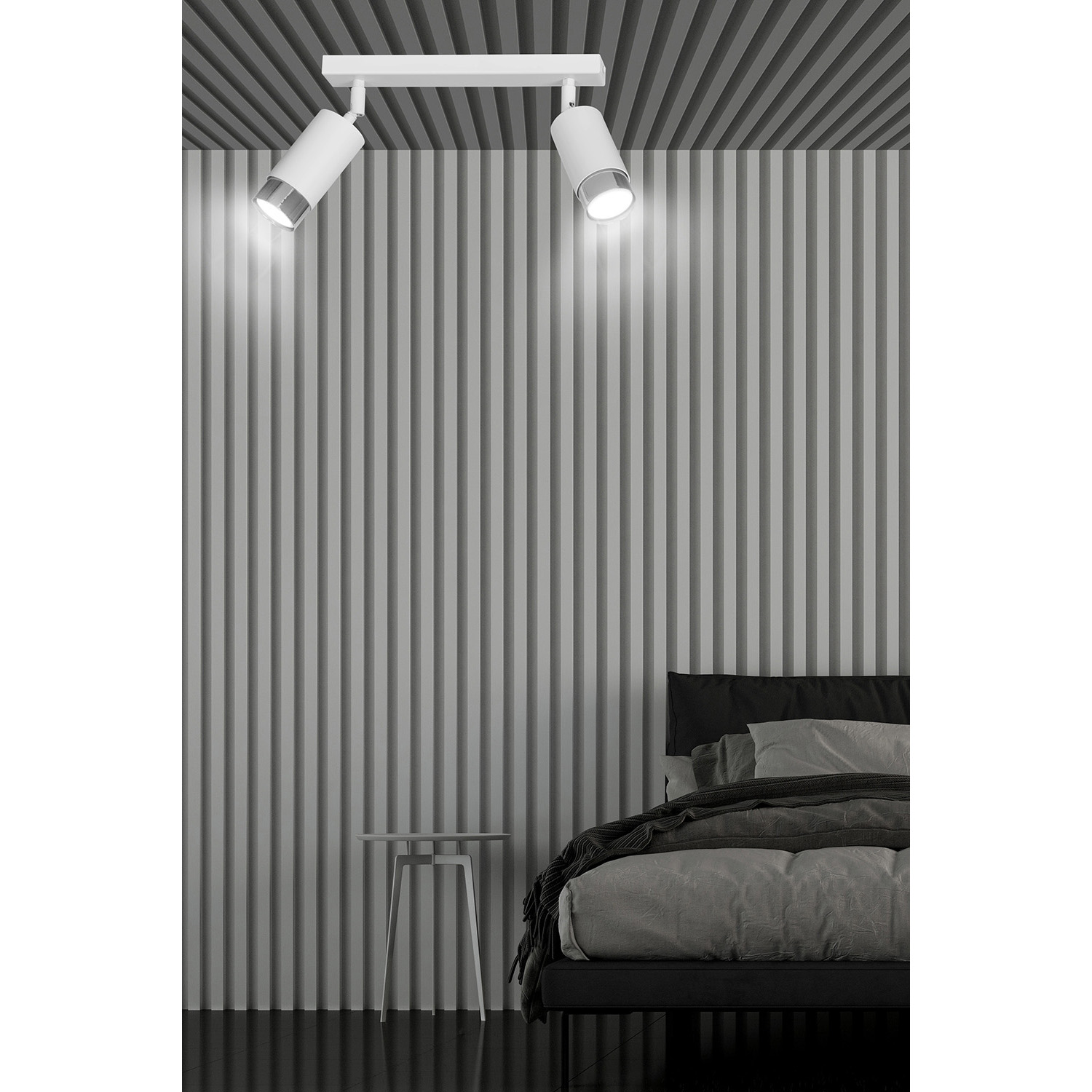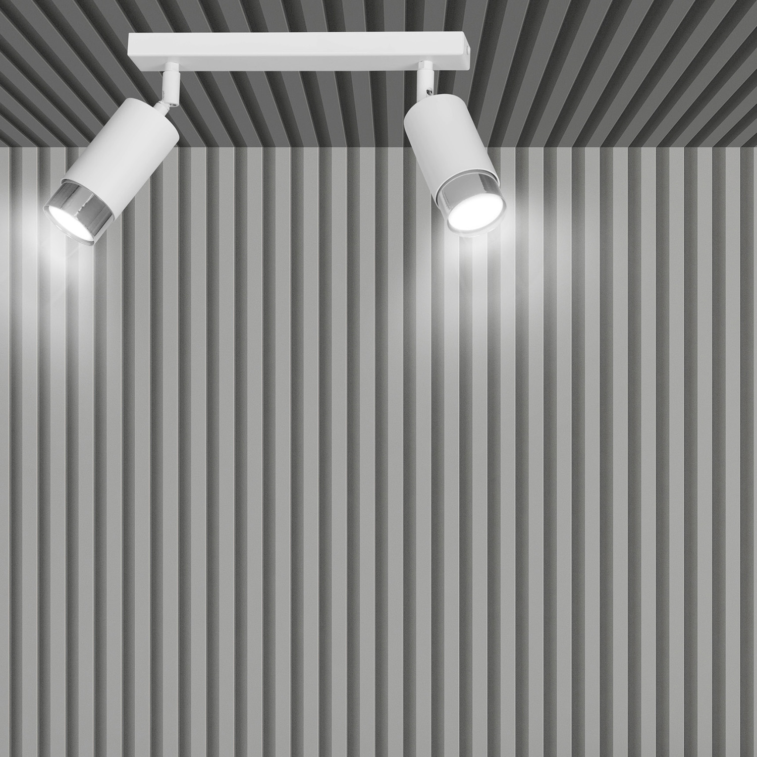 Plafoniera a faretti 2 luci con base rettangolare in acciaio bianco e 2 paralumi cilindrici regolabili in metallo bianco con teste in metallo cromato. Le lampade si distinguono per la struttura semplice e la forma che si adatta perfettamente a qualsiasi disposizione. La luce focalizzata e direzionale è perfetta come illuminazione aggiuntiva sopra il bancone della cucina, nel corridoio o accanto al comodino. La possibilità di regolare l'angolazione della luce migliora ulteriormente la funzionalità della lampada.