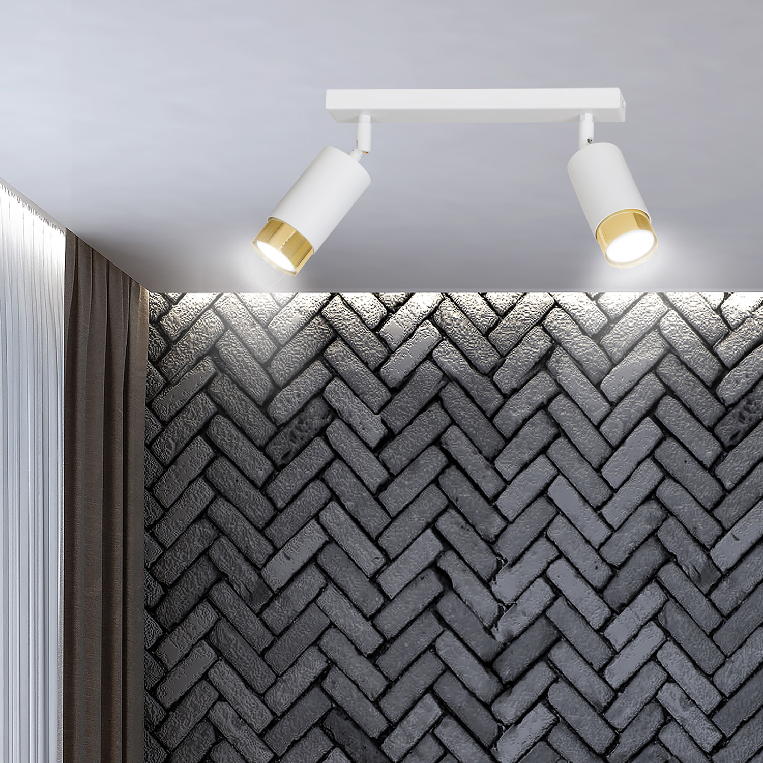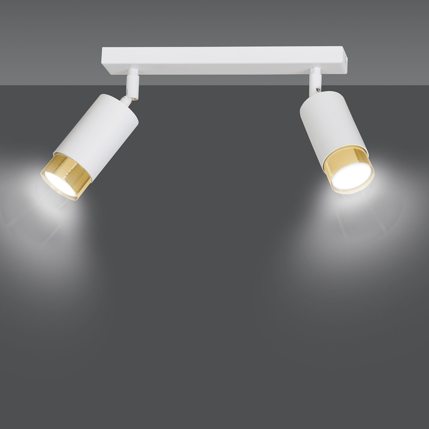Plafoniera a faretti 2 luci con base rettangolare in acciaio bianco e 2 paralumi cilindrici regolabili in metallo bianco con teste in metallo dorato. Le lampade si distinguono per la struttura semplice e la forma che si adatta perfettamente a qualsiasi disposizione. La luce focalizzata e direzionale è perfetta come illuminazione aggiuntiva sopra il bancone della cucina, nel corridoio o accanto al comodino. La possibilità di regolare l'angolazione della luce migliora ulteriormente la funzionalità della lampada.
