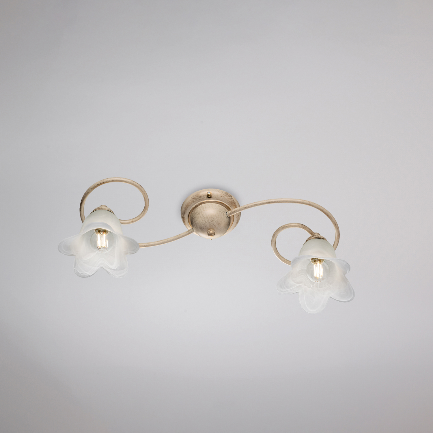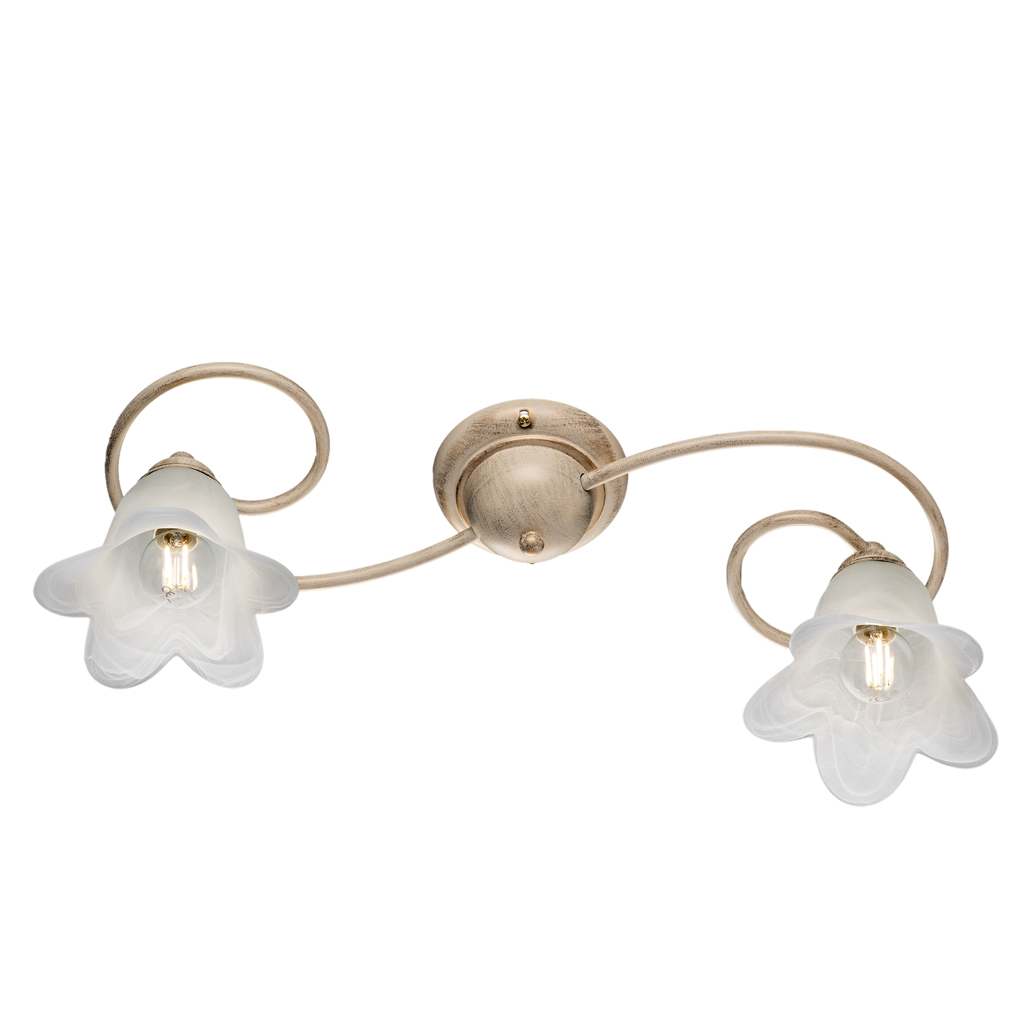 Plafoniera 2 Luci Alice Ferro Battuto Avorio E Oro Vetro Bianco