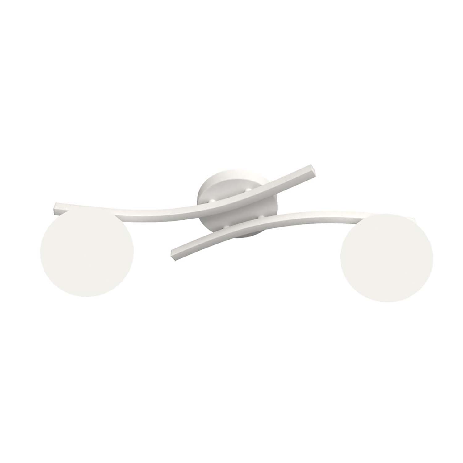 Plafoniera a 2 luci con base tonda in acciaio bianco e bracci che terminano con diffusori a sfera in vetro bianco. Questa plafoniera è ideale per illuminare soggiorni, ingressi, camere da letto o anche uffici, grazie alla sua capacità di adattarsi facilmente a diversi tipi di spazi e decorazioni. Il design semplice ma elegante, unito alla funzionalità e alla qualità dei materiali, la rende una scelta perfetta per chi cerca un'illuminazione elegante e moderna