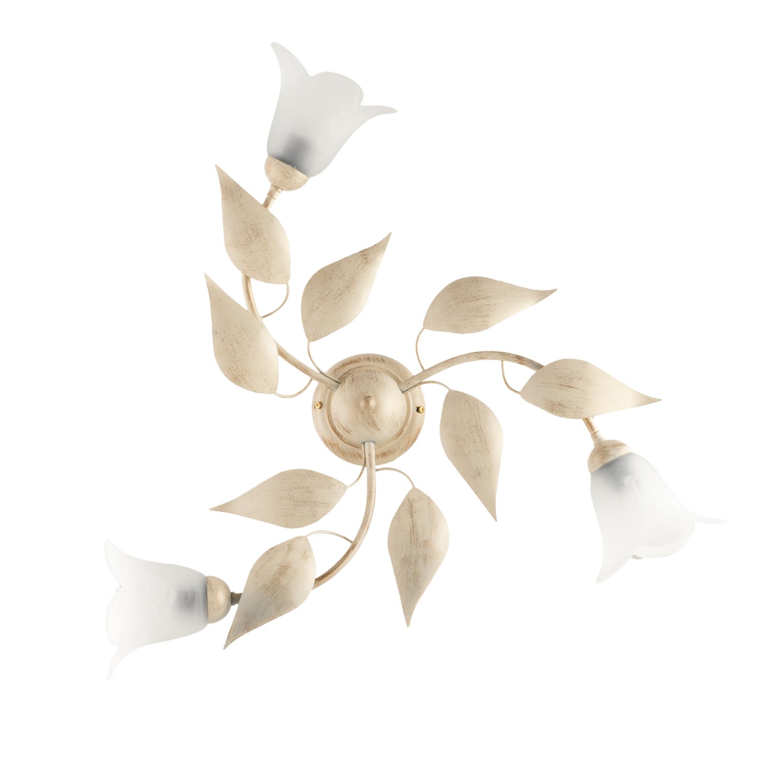 Plafoniera a 3 luci in ferro laccato avorio con decorazione effetto antichizzato oro e diffusori in vetro centrifugato alabastro bianco. . I bracci sono disposti in maniera circolare e grazie alle foglie in metallo forgiate a mano ed ai diffusori a fiore questo articolo delicato e grazioso, in perfetto stile shabby chic, adornerà con eleganza e raffinatezza ogni ambiente. Disponibile anche nella versione bianco e argento.