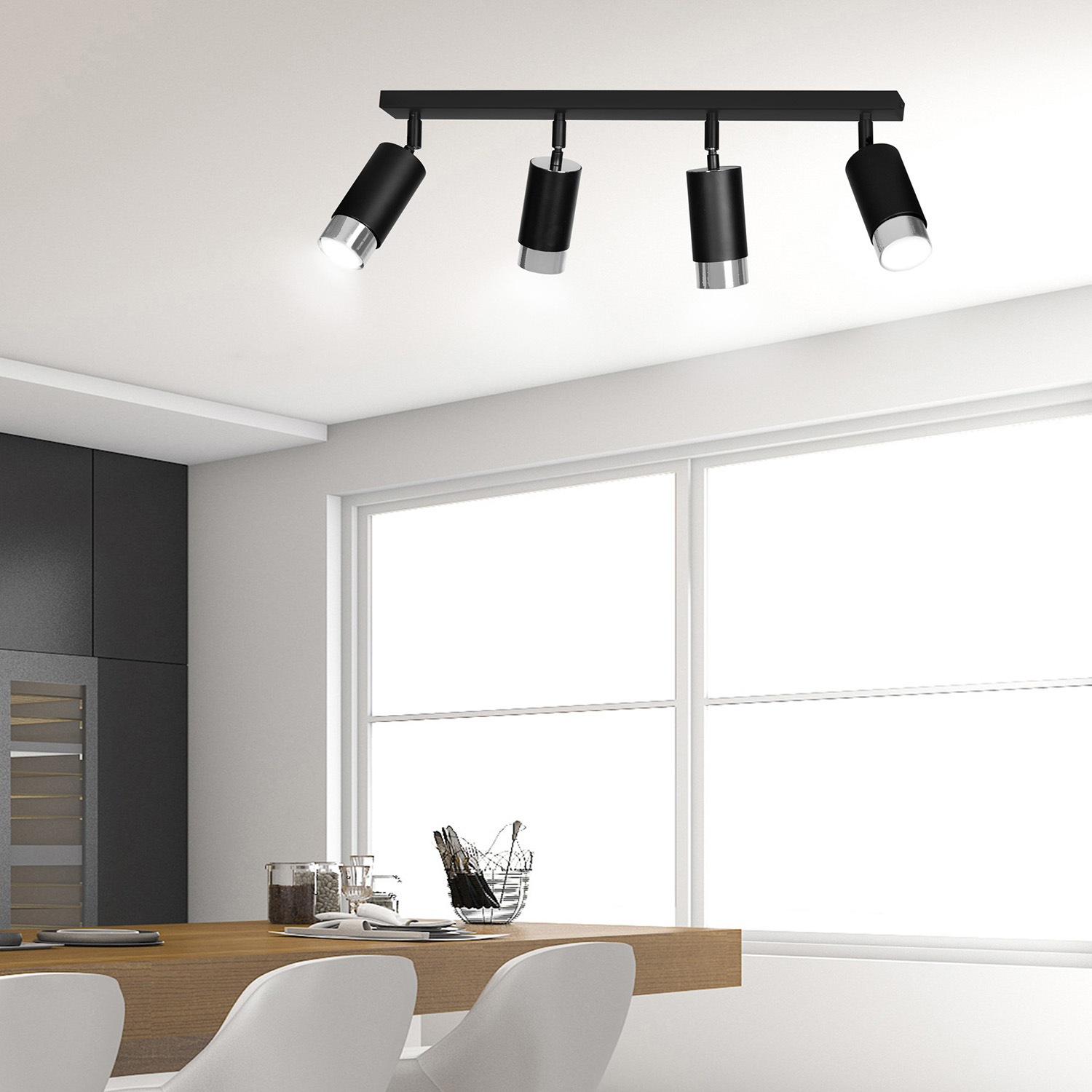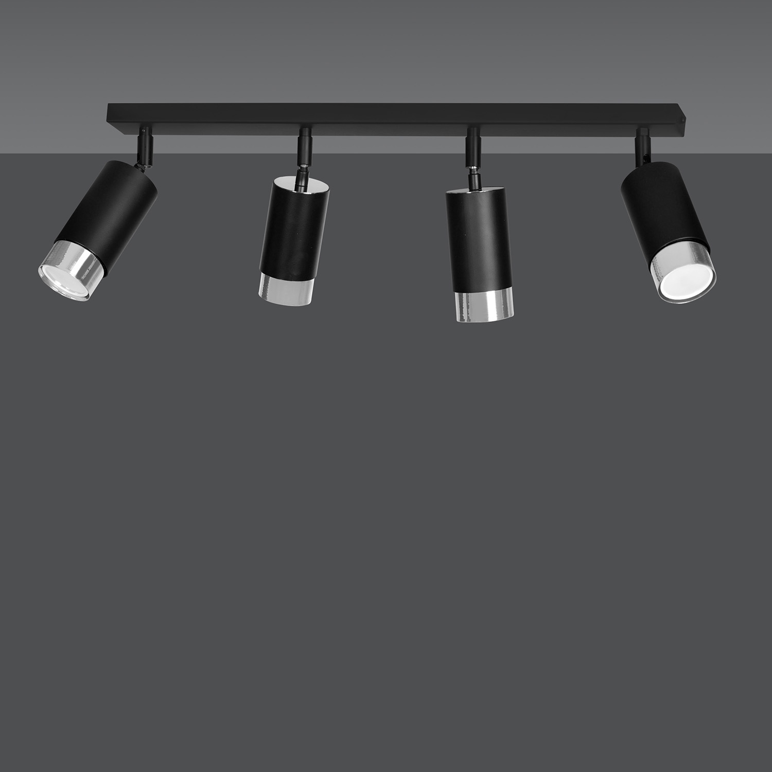 Plafoniera a faretti 4 luci con base rettangolare in acciaio nero e 4 paralumi cilindrici regolabili in metallo nero con teste in metallo cromato. Le lampade si distinguono per la struttura semplice e la forma che si adatta perfettamente a qualsiasi disposizione. La luce focalizzata e direzionale è perfetta come illuminazione aggiuntiva sopra il bancone della cucina, nel corridoio o accanto al comodino. La possibilità di regolare l'angolazione della luce migliora ulteriormente la funzionalità della lampada.