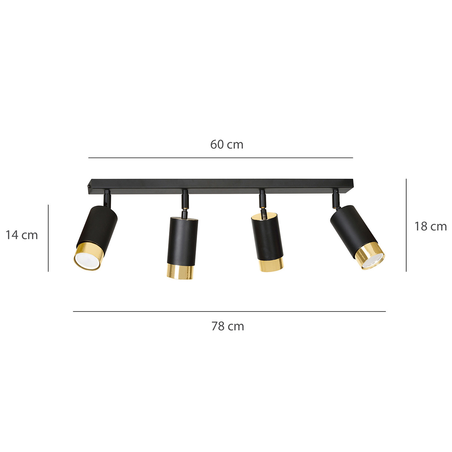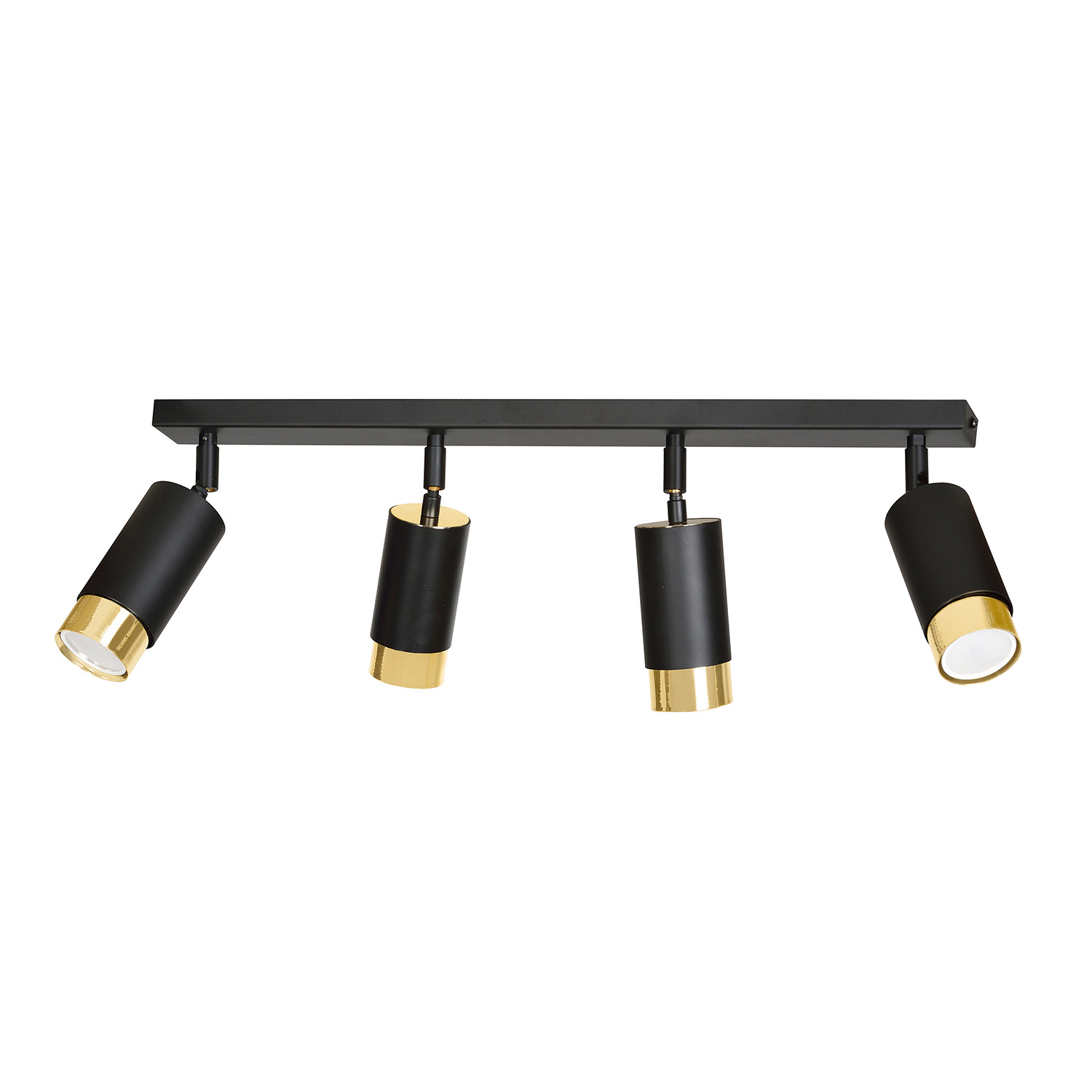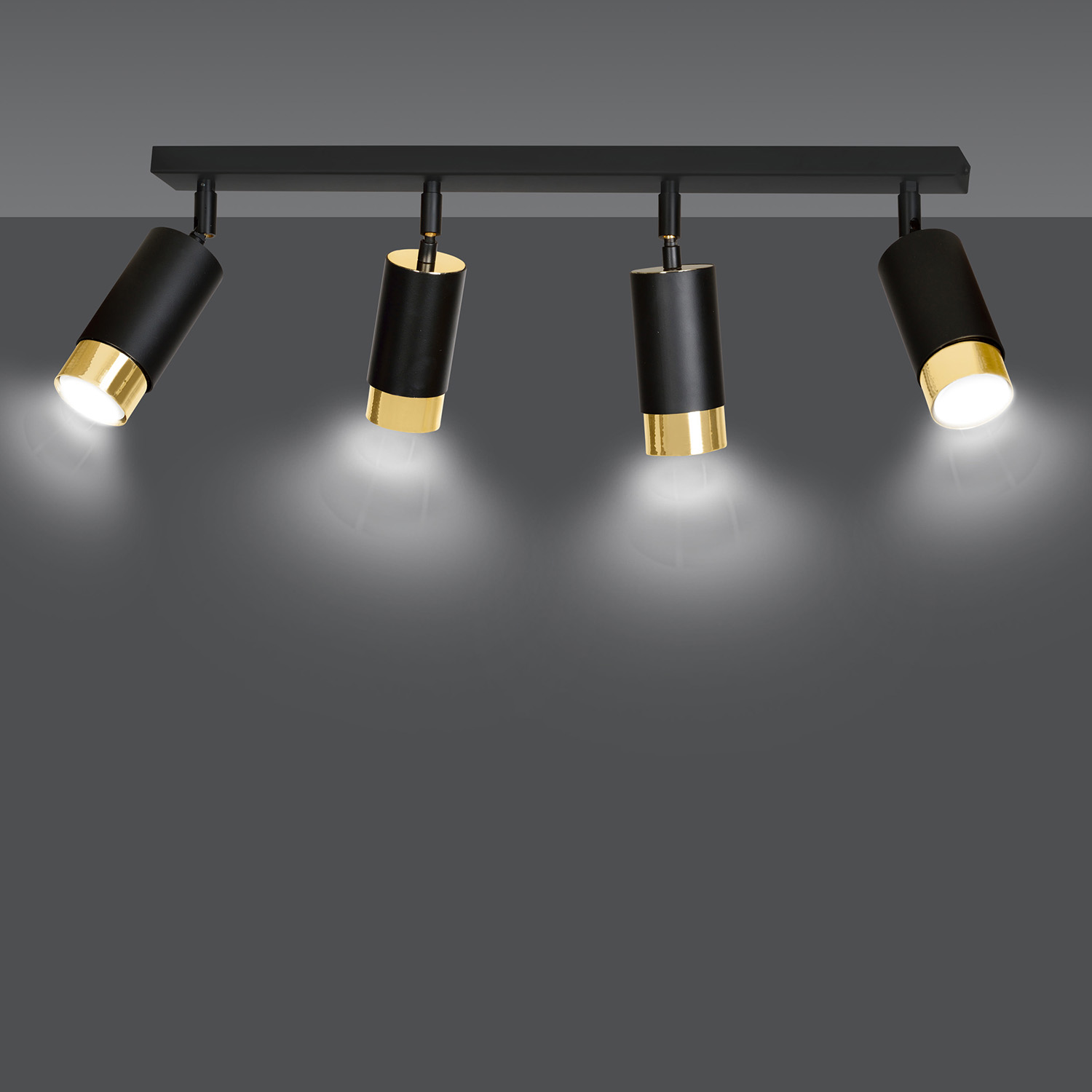 Plafoniera a faretti 4 luci con base rettangolare in acciaio nero e 4 paralumi cilindrici regolabili in metallo nero con teste in metallo dorato. Le lampade si distinguono per la struttura semplice e la forma che si adatta perfettamente a qualsiasi disposizione. La luce focalizzata e direzionale è perfetta come illuminazione aggiuntiva sopra il bancone della cucina, nel corridoio o accanto al comodino. La possibilità di regolare l'angolazione della luce migliora ulteriormente la funzionalità della lampada.