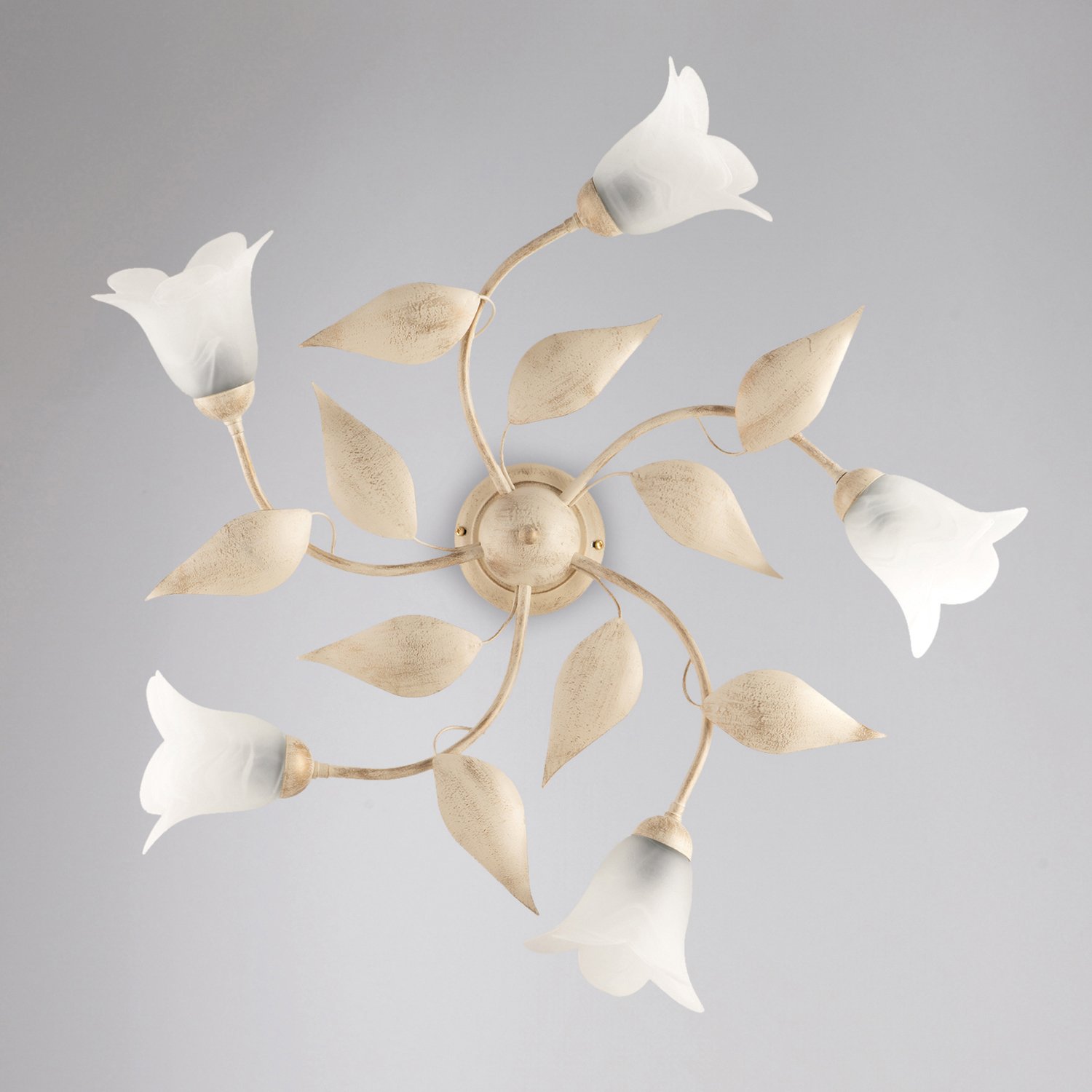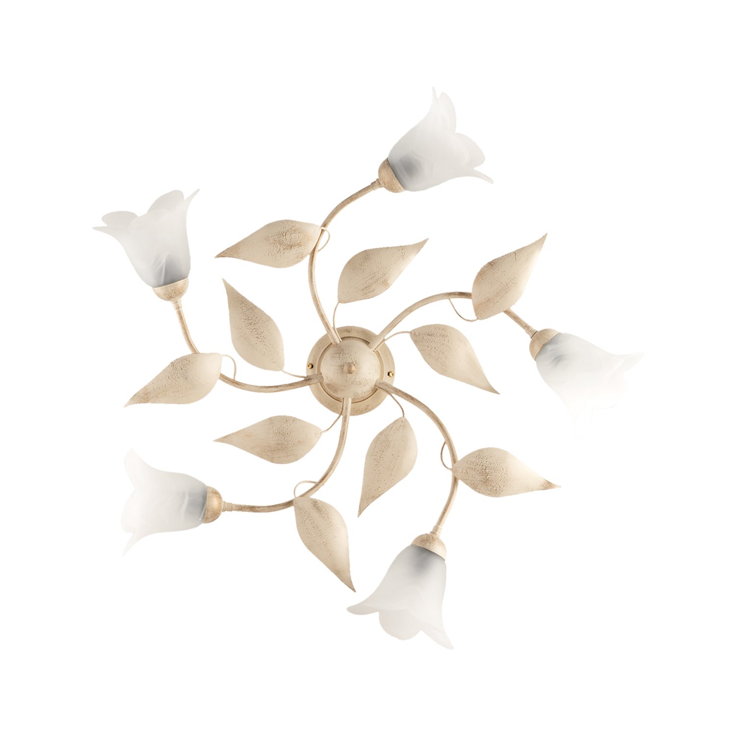 Plafoniera a 5 luci in ferro laccato avorio con decorazione effetto antichizzato oro e diffusori in vetro centrifugato alabastro bianco. . I bracci sono disposti in maniera circolare e grazie alle foglie in metallo forgiate a mano ed ai diffusori a fiore questo articolo delicato e grazioso, in perfetto stile shabby chic, adornerà con eleganza e raffinatezza ogni ambiente. Disponibile anche nella versione bianco e argento.