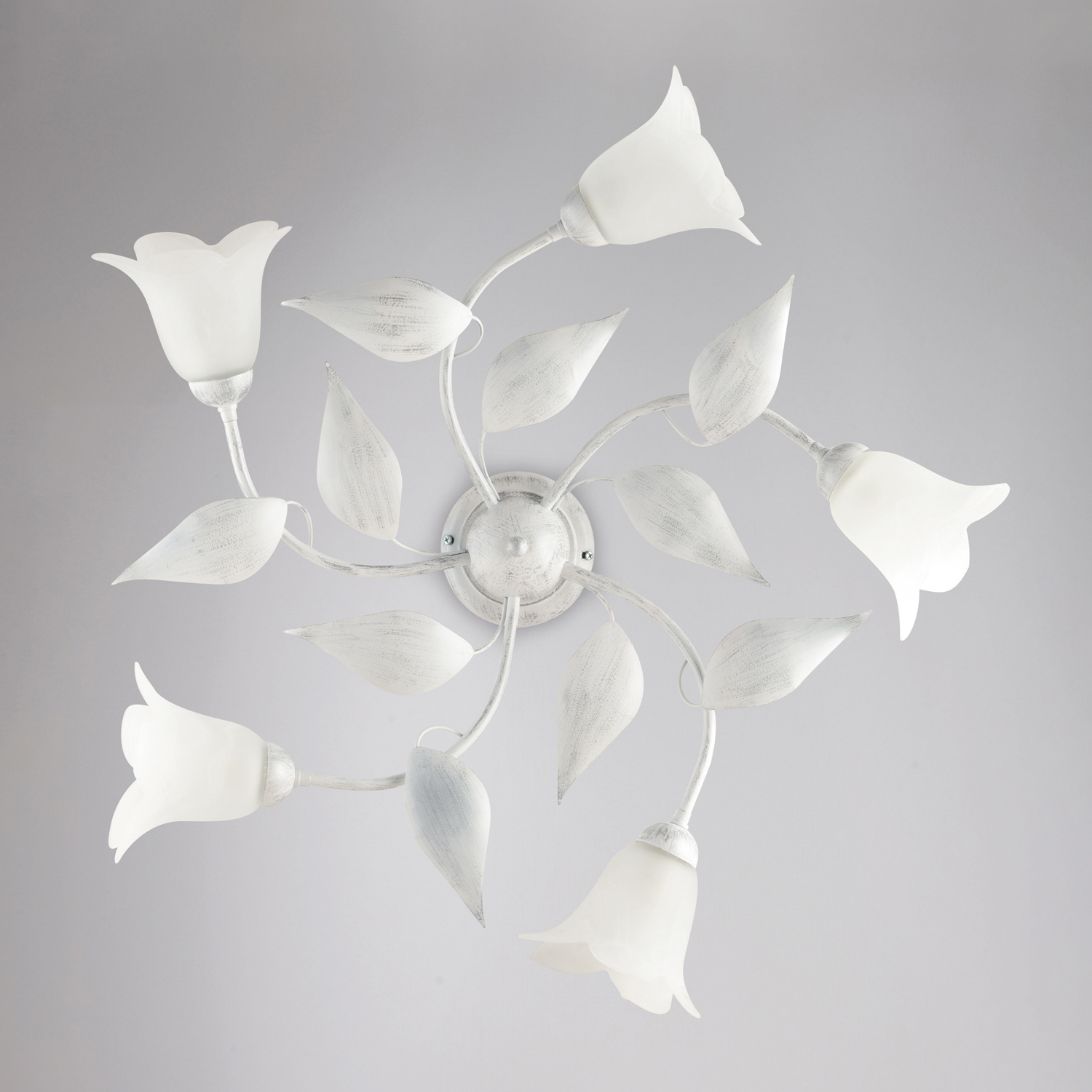 Plafoniera a 5 luci in ferro laccato bianco con decorazione effetto antichizzato argento e diffusori in vetro centrifugato alabastro bianco. . I bracci sono disposti in maniera circolare e grazie alle foglie in metallo forgiate a mano ed ai diffusori a fiore questo articolo delicato e grazioso, in perfetto stile shabby chic, adornerà con eleganza e raffinatezza ogni ambiente. Disponibile anche nella versione avorio e oro.