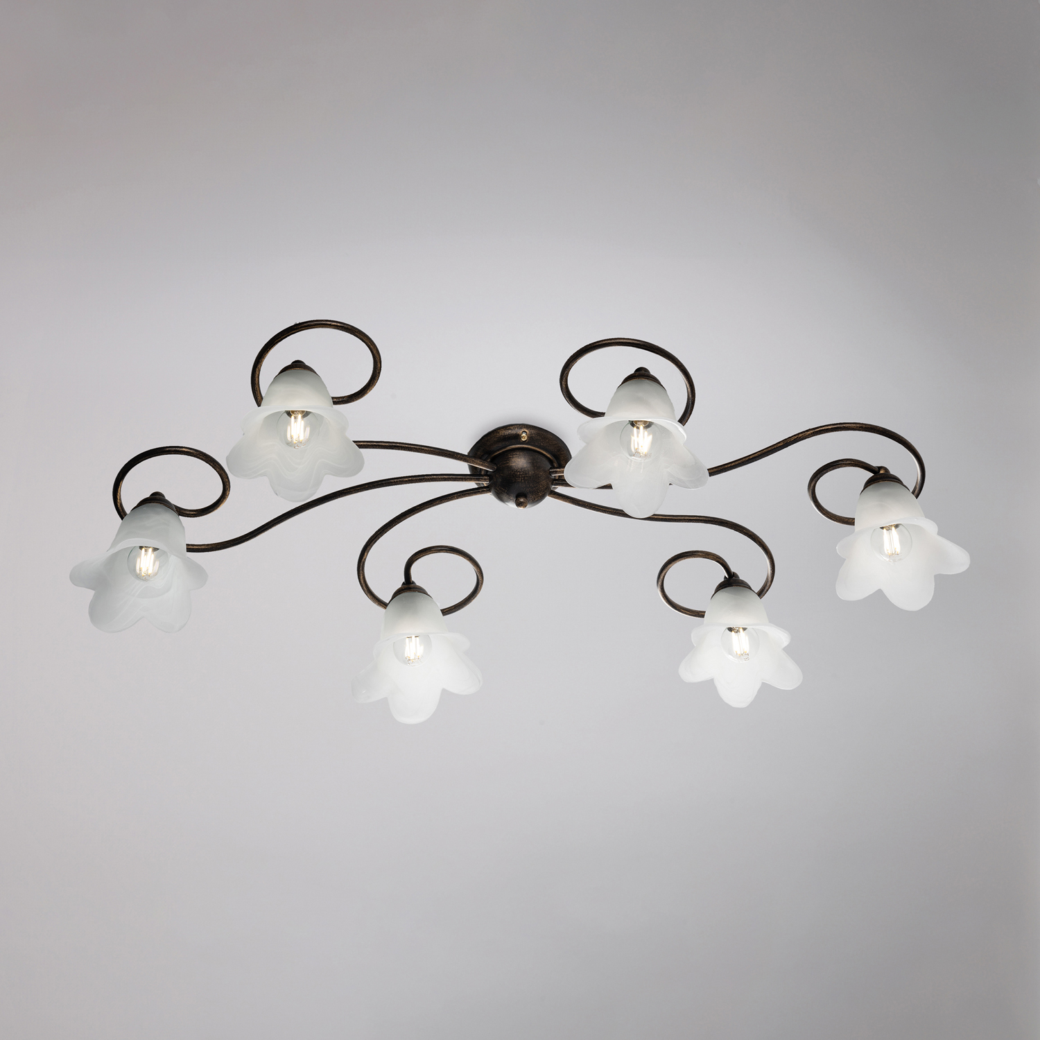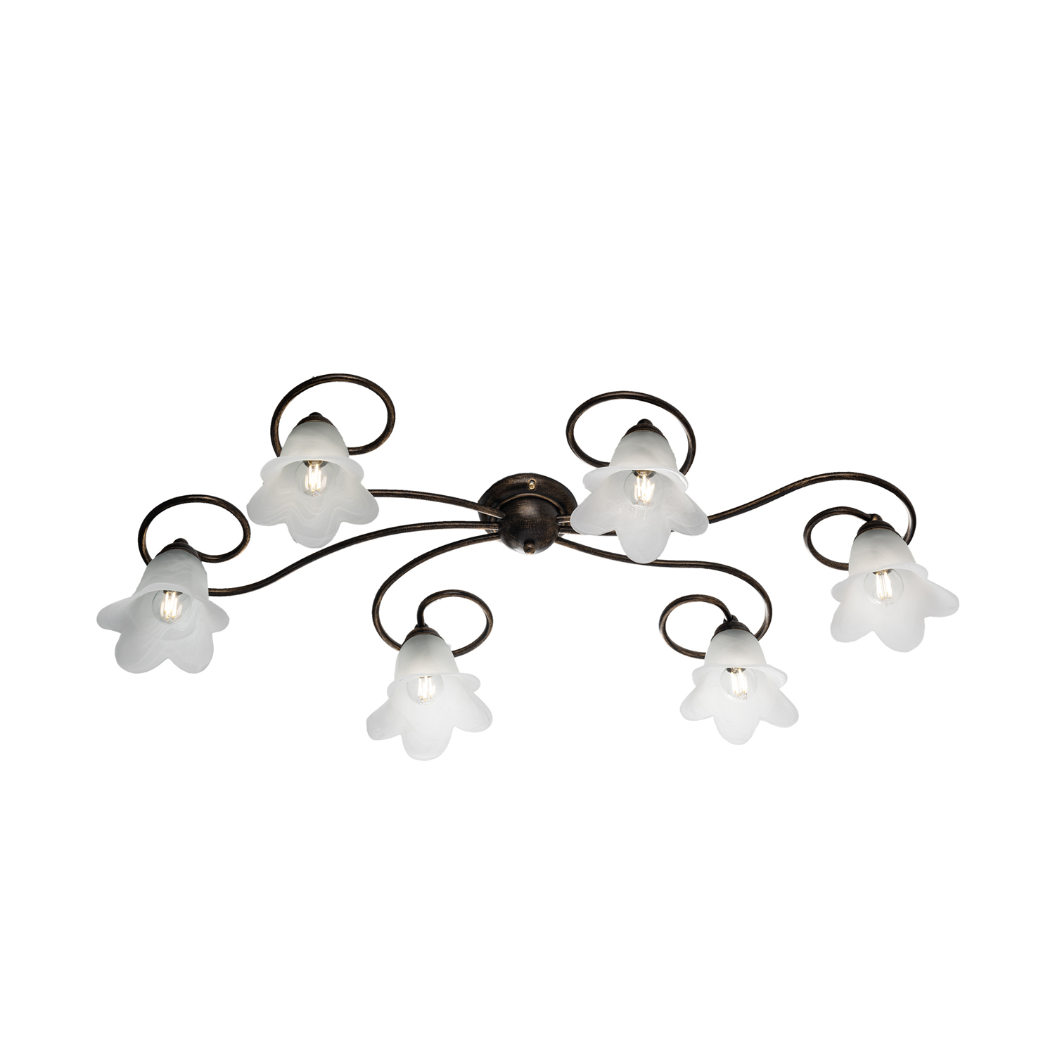 Plafoniera 6 Luci Alice Ferro Battuto Marrone E Oro Vetro Bianco