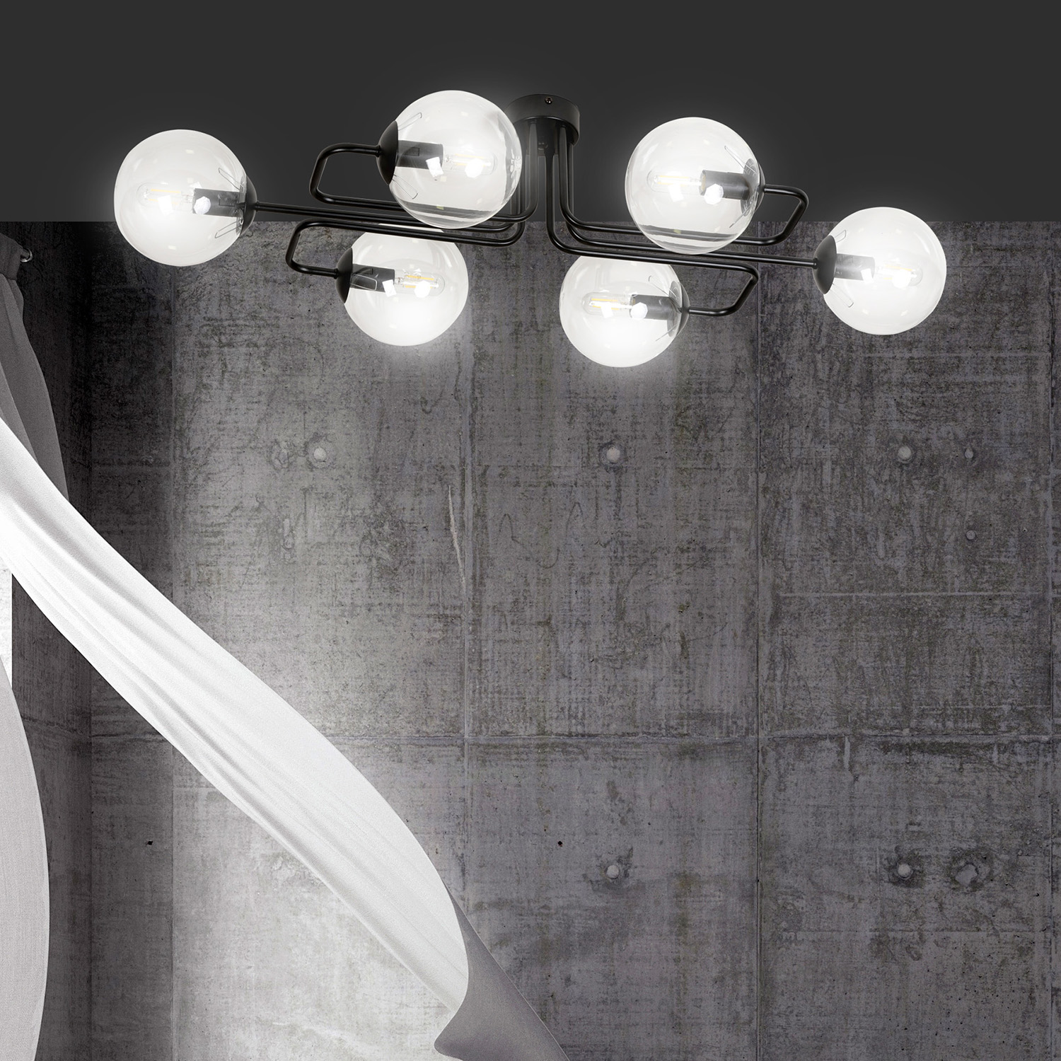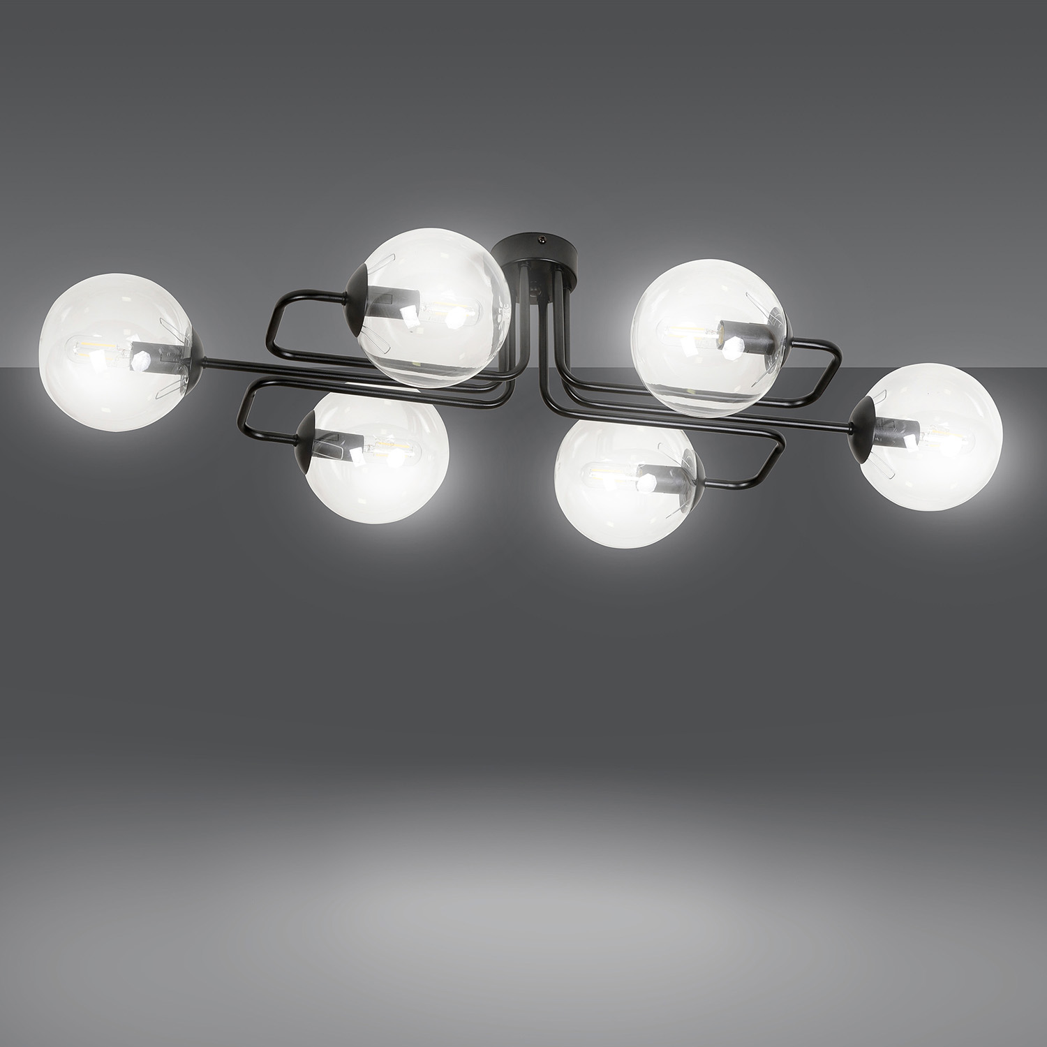 Plafoniera 6 Luci Brandi In Acciaio Nero A Bracci E Sfere In Vetro Trasparente