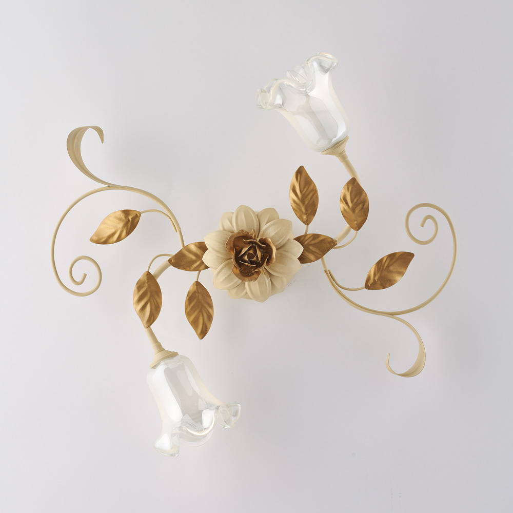 Questa plafoniera è un'opera d'arte artigianale realizzata in Italia.. Plafoniera classica a 2 luci in ferro laccato avorio con decorazioni decape composto da una grande rosa e un fiore centrale alla base ed eleganti bracci decorati con foglie color oro, che terminano con diffusori di vetro in piastra lavorato a mano, color bianco. La sua struttura in ferro laccato color avorio decapé è lavorata a mano e rifinita nei minimi dettagli, il che conferisce alla plafoniera un'eleganza rustica e naturale. Perfetta per decorare e illuminare l'ingresso di una casa, la sala da pranzo o qualsiasi altro spazio che richieda un tocco rustico ed elegante. Il design unico e l'artigianalità di questa plafoniera la rendono un pezzo unico e irripetibile, che valorizza l'arredamento della tua casa. Tutti i nostri articoli sono prodotti esclusivamente in Italia e rispettano rigorosamente le normative CE. Prodotti realizzati per la maggior parte dei casi senza l'ausilio delle macchine salvo qualche eccezione in cui, le stesse, sono utilizzate in modo marginale. Le piccole imperfezioni e le variazioni nelle misure sono, quindi, non da attribuirsi ad un difetto di fabbricazione quanto alla particolarità ed alla composizione stessa del prodotto interamente confezionato a mano. Essendo prodotti realizzati artigianalmente, su richiesta è possibile effettuare piccole modifiche o personalizzazioni al prodotto.