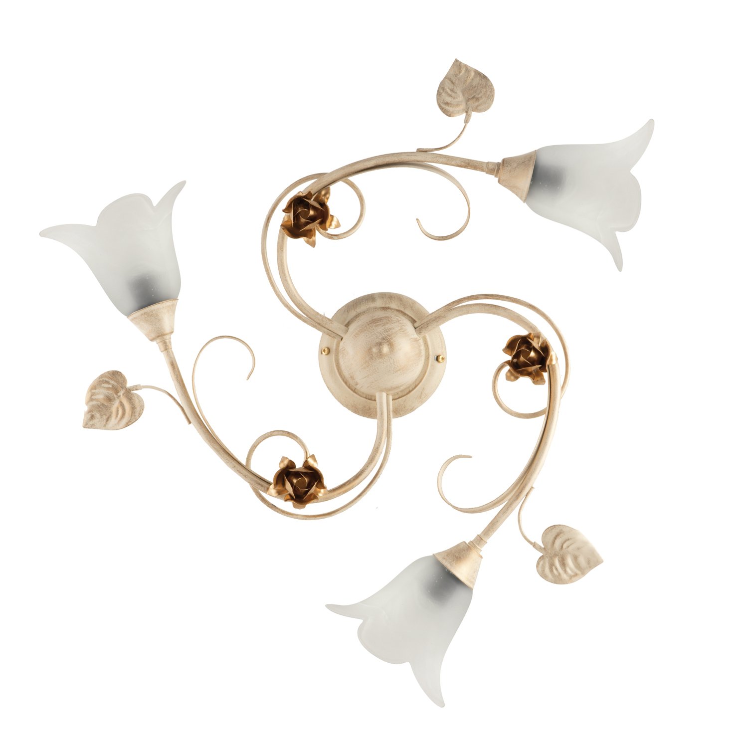 Plafoniera 3 luci dallo stile classico in ferro laccato con pittura termoindurente avorio e decorazione oro chiaro. Corredata con diffusori in vetro bianchi e ambra con lampadine E14. Prodotto realizzato interamente a mano da Mastri Artigiani con materiali 100% Italiani.