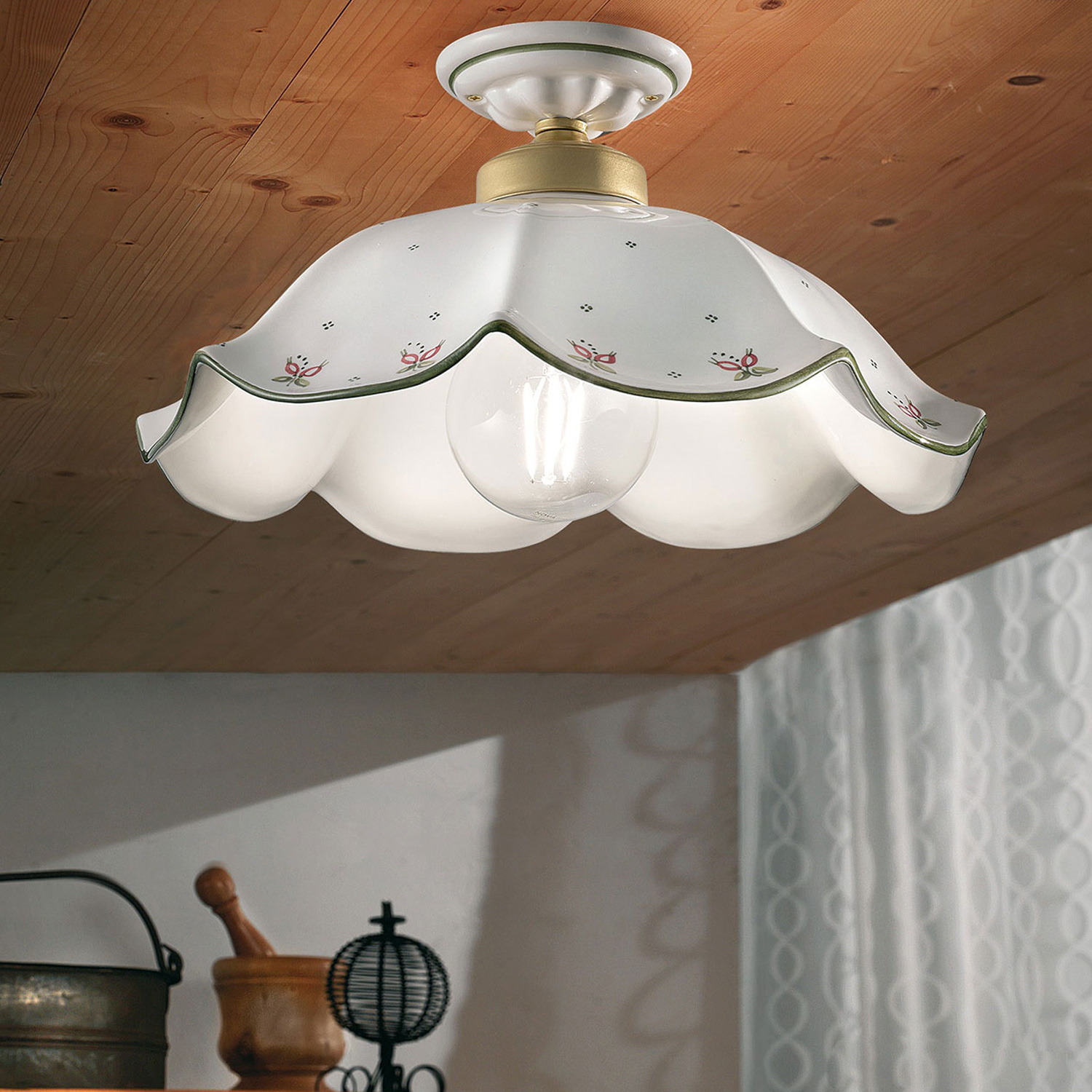 Plafoniera Classica Belluno Ceramica E Ottone Satinato Decorato 1 Luce E27