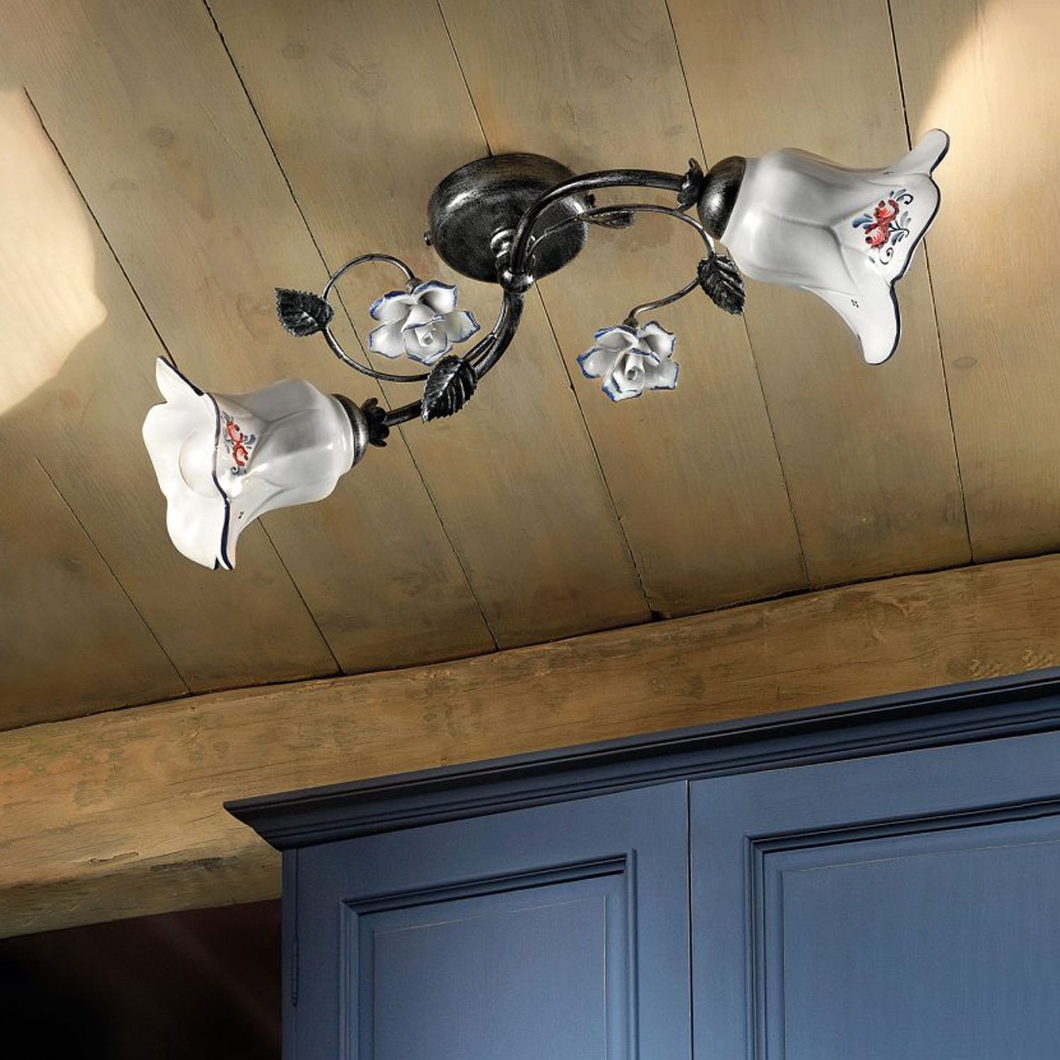 Collezione PISAELEGANZA ILLUMINATA CON STILE AUDACEPlafoniera 2 Luci E27 in ceramica decoro filo blu con montatura nero sfumato rame frutto di una lavorazione esegui..