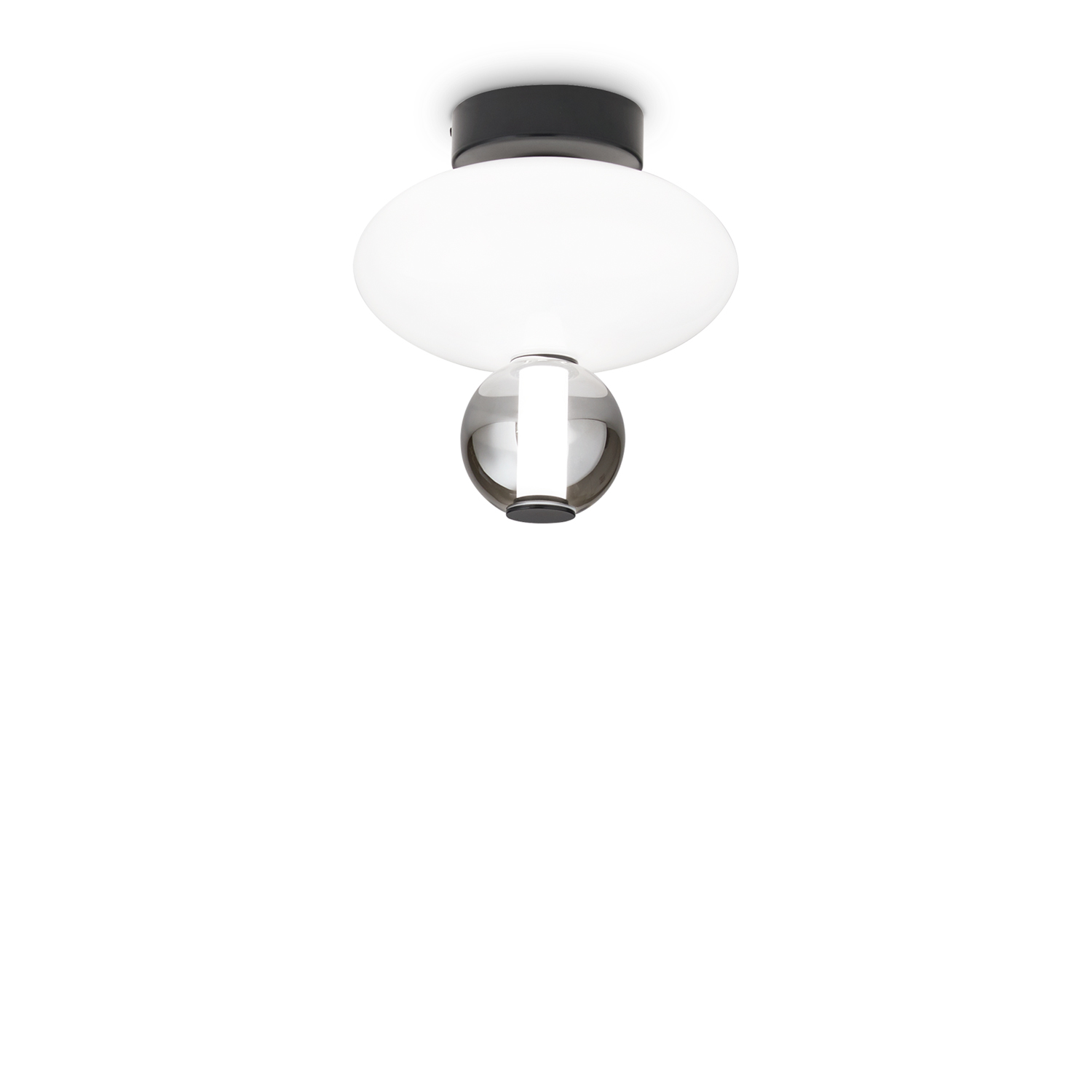 Plafoniera Contemporanea Lumiere Metallo Nero Led Integrato 18W 3000K IP20 A++ h.35 D.28 L. Lampadina inclusa. Montatura e dettagli in metallo verniciato nero opaco. Diffusore tubolare centrale bianco. Elementi decorativi in vetro soffiato bianco lucido e trasparente grigio. Cavo in pvc.