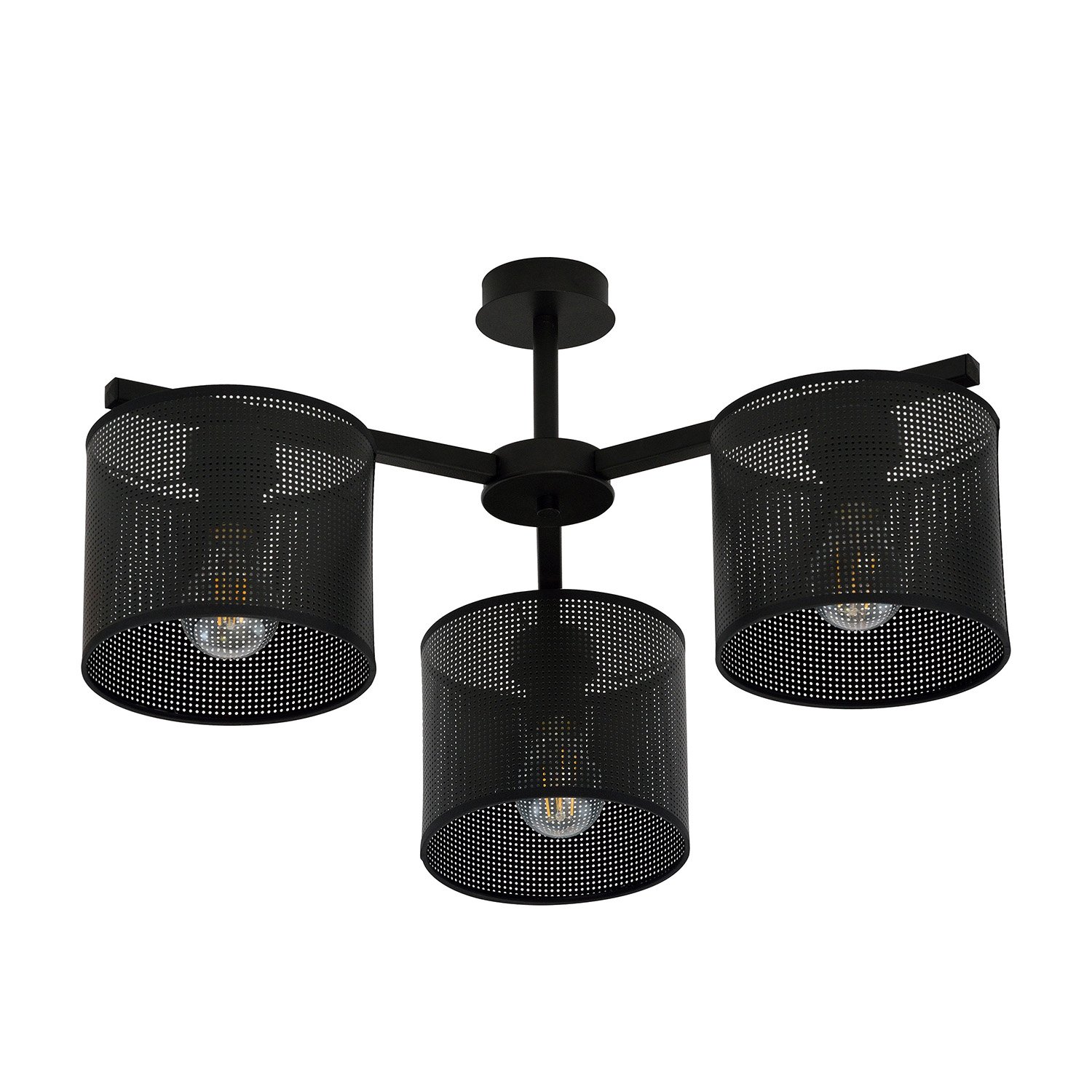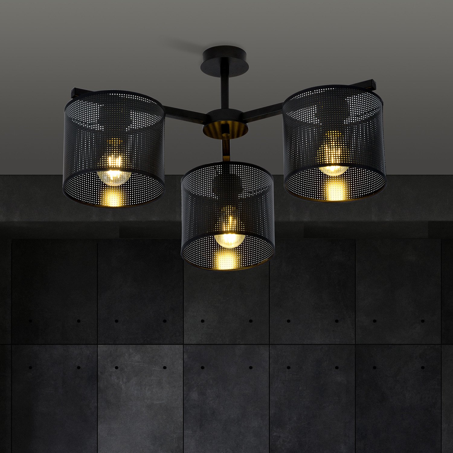 Plafoniera realizzata con base in metallo di colore nero con bracci dritti e tre paralumi cilindrici perforati in plastica e tessuto di colore nero. La loro costruzione e forma semplici si adattano perfettamente a varie disposizioni. I coprilampada, con un interessante motivo traforato e un interno dorato, lasciano passare molta luce, creando un'atmosfera unica nella stanza. La serie JORDAN è adatta sia per arrangiamenti minimalisti che classici.