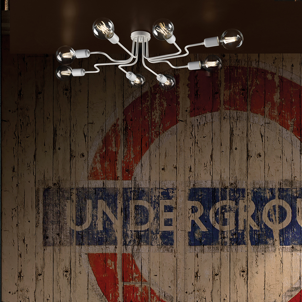 Collezione LoftSTILE INDUSTRIAL PER CHI PREDILIGE FORME SEMPLICI MA DECISEPlafoniera 8 Luci in ferro laccato bianco con decorazione argento in tipico stile Industria..