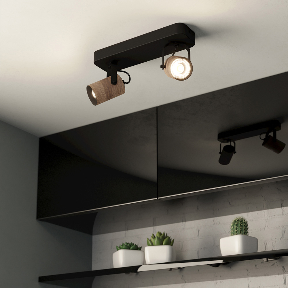 Plafoniera della serie CAYUCA 2 luci con rosone in acciaio nero e diffusore orientabile in legno color marrone.. Monta una lampadina GU10 non inclusa. Ha una altezza totale di 12cm.