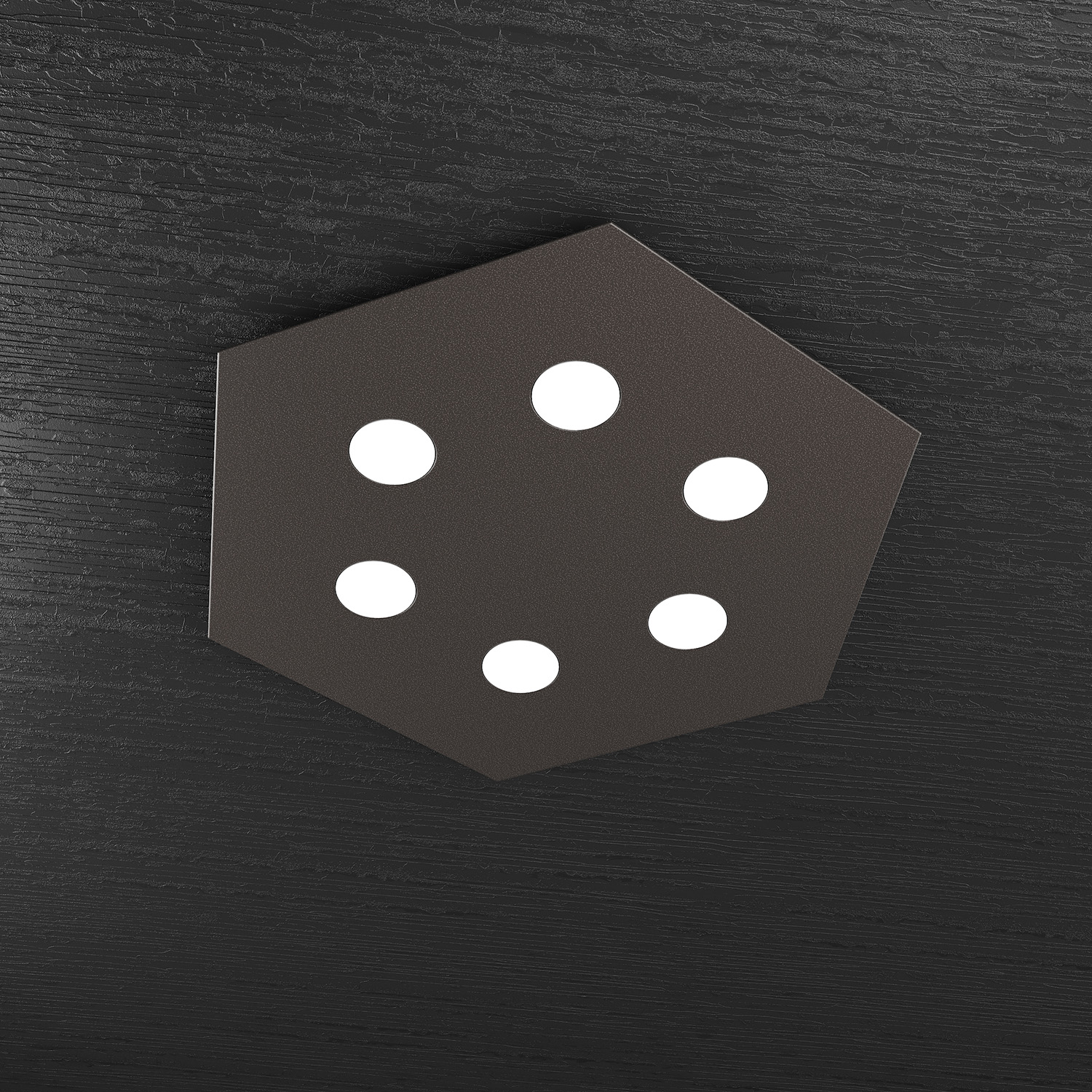 Plafoniera 6 luci esagonale formata da lastre quadrate di metallo verniciato in finitura marrone.. Un punto di forza del prodotto consiste nel non utilizzare dei led integrati ma una lampadina Gx53 che, una volta montata, arriva a filo della lastra metallica e può essere facilmente sostituita dall’esterno. Disponibile anche la versione sospensione a 6 luci e sospensine 6 luci più 1 luce,dalle stesse dimensioni della plafoniera ed è disponibile in tutte le finiture esistenti.Questo articolo è disponibile in diverse finiture e/o dimensioni. E' possibile indicarlo nell'apposito campo NOTE presente in conclusione di ordine oppure contattarci dopo aver effettuato l'ordine.