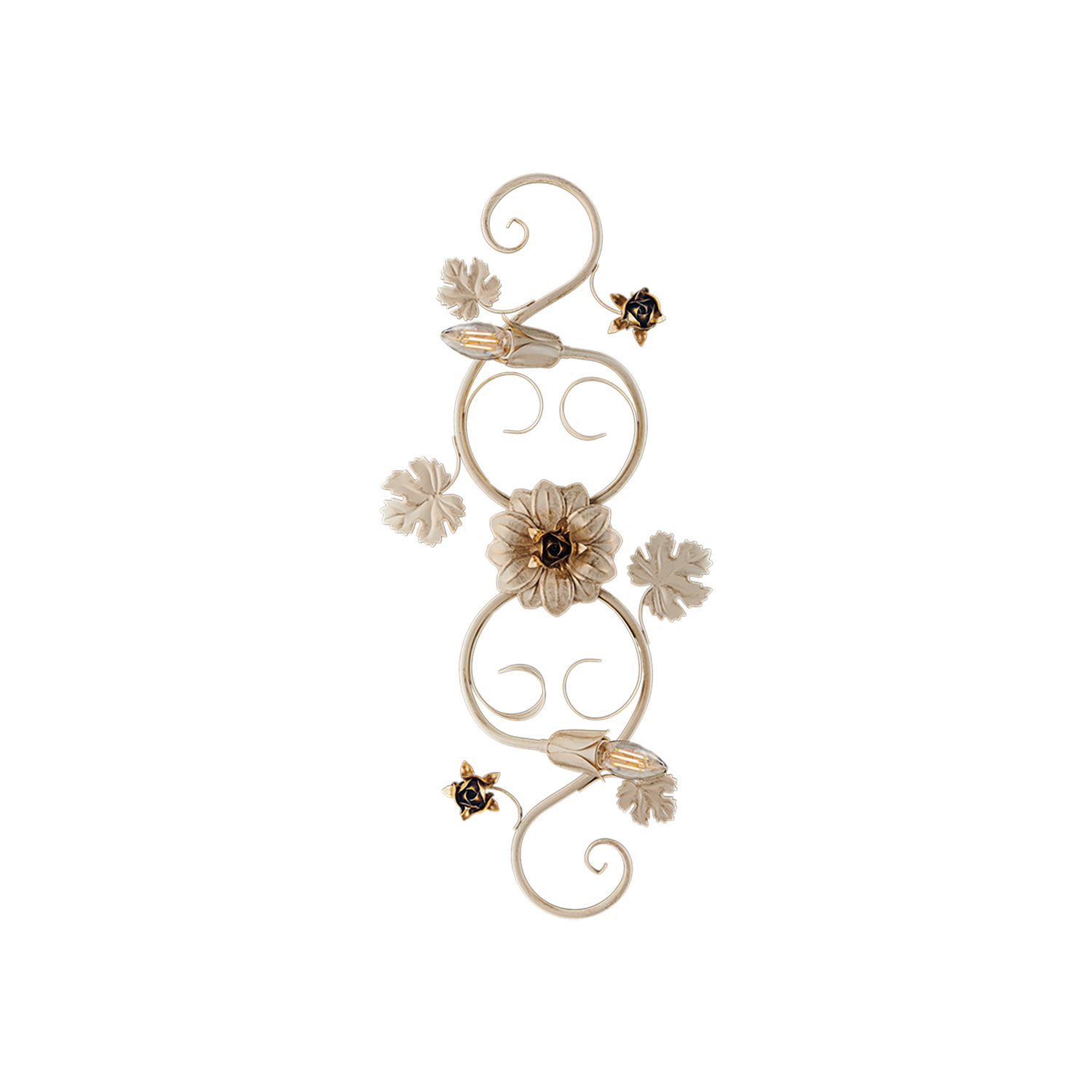 Collezione IrisATMOSFERA FLOREALE PER UN CLASSICO SEMPRE ATTUALEApplique 1 luce in ferro laccato avorio con decorazione effetto antichizzato oro antico.. Composta da..