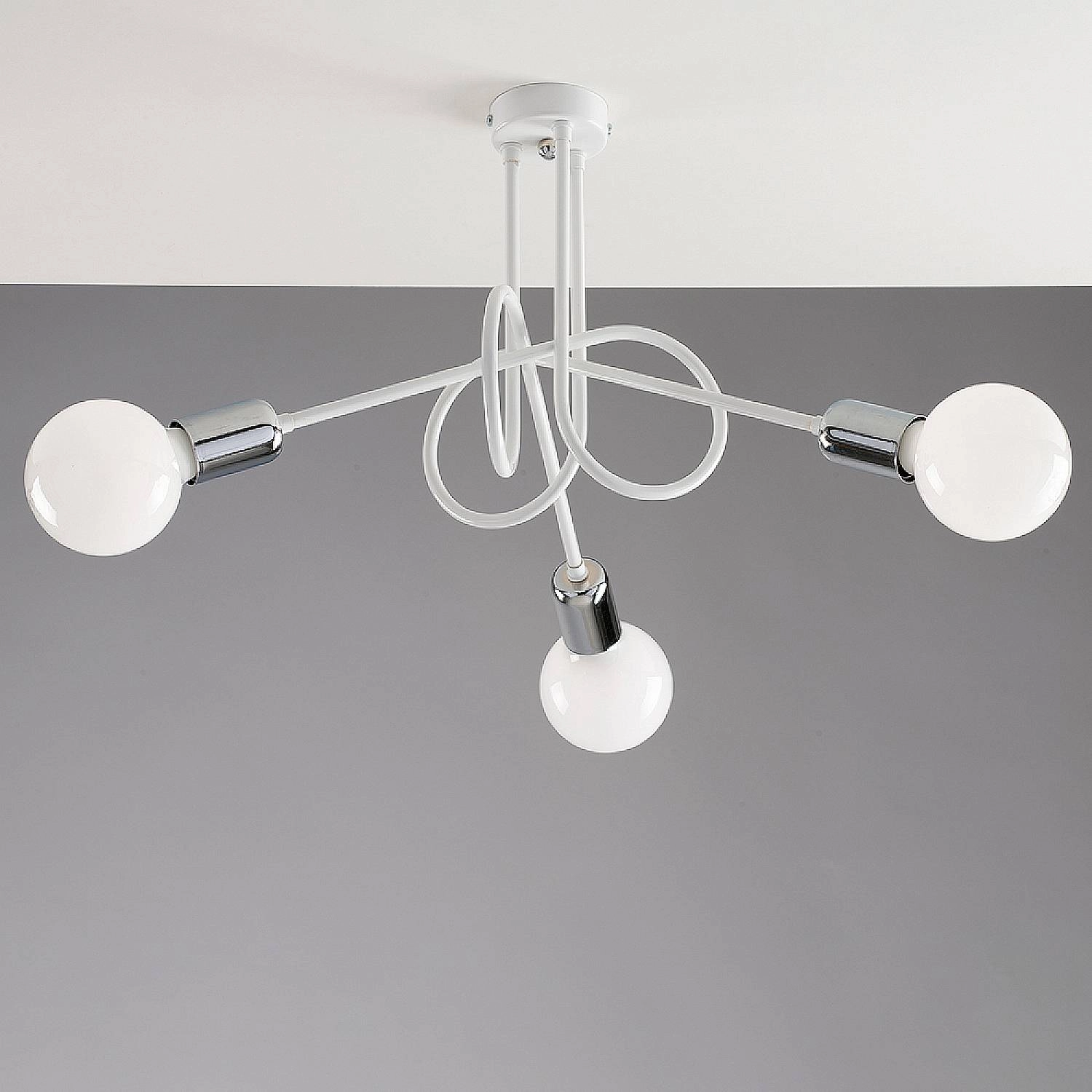 Plafoniera moderna dal design minimal composta da 3 sottili bracci in metallo laccato bianco, con un leggiadro gioco di grovigli tra di loro.. Semplice, pulita ed essenziale ma estremamente moderna e contemporaneamente versatile riesce ad accontentare ogni esigenza ed illuminare qualsiasi ambiente dalla cucina, alla sala da pranzo, alla cameretta. Le rifiniture sono in metallo cromato.