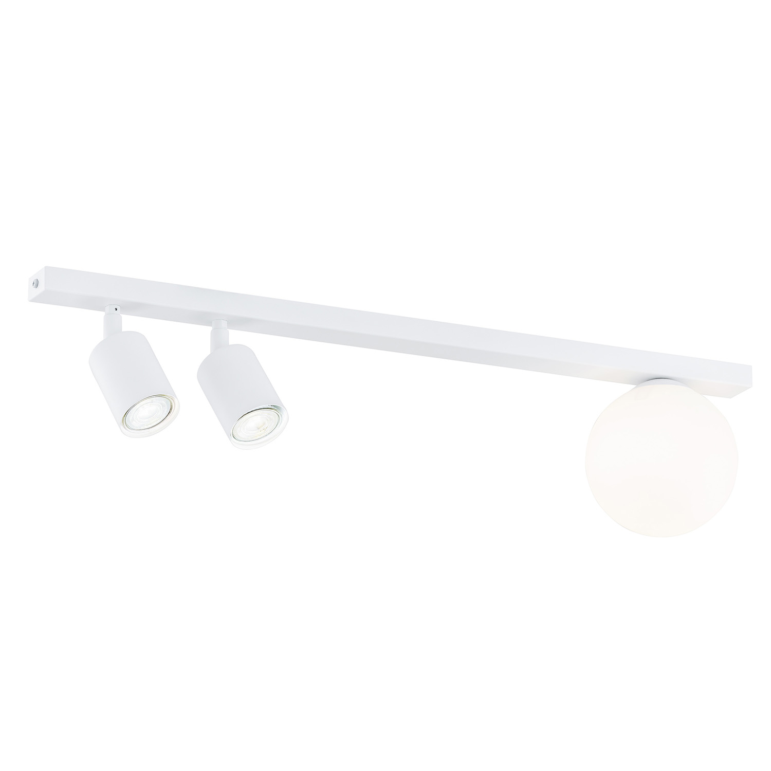 Collezione SobekPER CHI AMA CIRCONDARSI DI BELLEZZA VERAPlafoniera con base rettangolare d'acciaio bianco, 3 faretti orientabili e un diffusore a sfera in vetro per ..