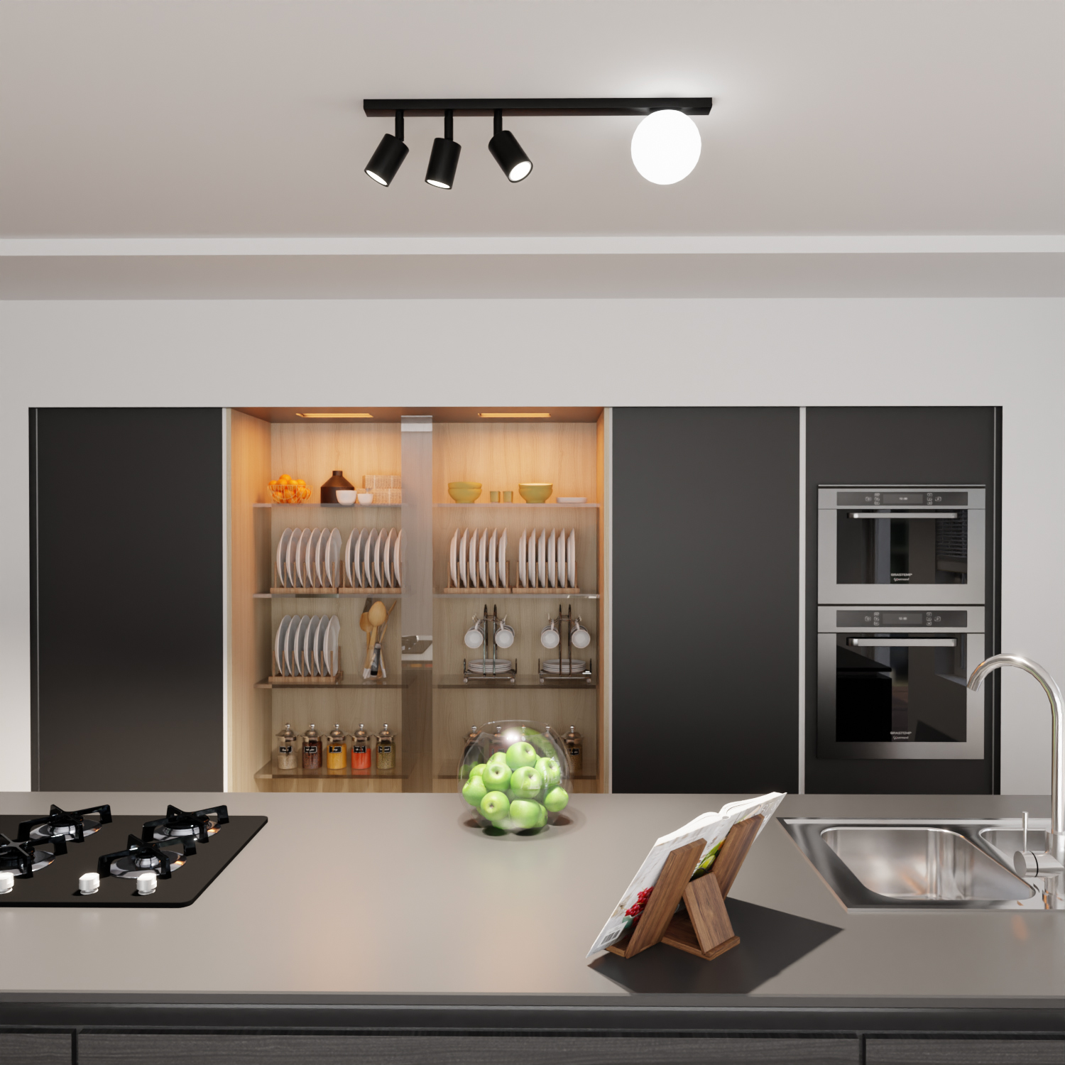 Collezione SobekPER CHI AMA CIRCONDARSI DI BELLEZZA VERAPlafoniera con base rettangolare d'acciaio nero, 3 faretti orientabili E14 e un diffusore a sfera in vetro pe..