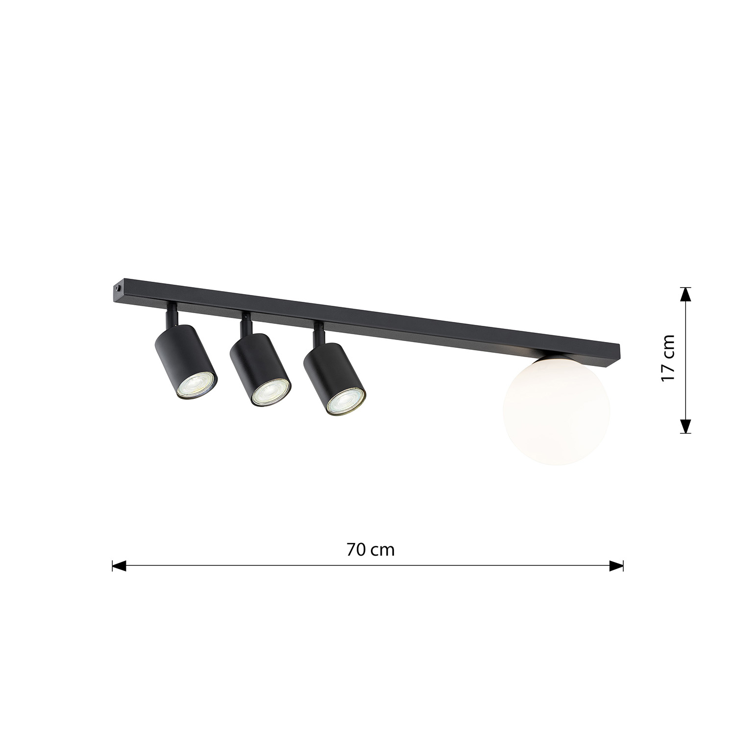 Plafoniera con base rettangolare d'acciaio nero, 3 faretti orientabili E14 e un diffusore a sfera in vetro per avere un'illuminazione sia diretta che indiretta. Il suo design minimalista si adatta perfettamente a varie disposizioni interne, aggiungendo un carattere moderno. La serie Sobek non riguarda solo la luce radiante; è anche un elemento decorativo unico che unisce funzionalità ed estetica.