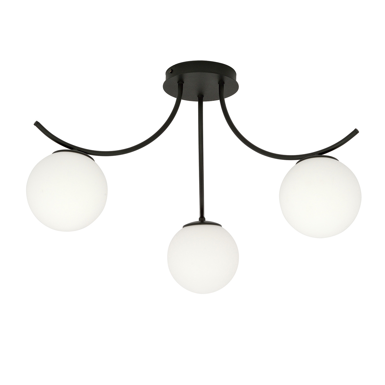 Lampada da soffitto moderna realizzata con una base rotonda in metallo di colore nero con bracci curvi e tre paralumi sferici in vetro di colore opale. Le delicate tonalità del vetro aggiungono eleganza e leggerezza. La forma minimalista della lampada BOSTON illumina efficacemente ampi spazi e si fonde perfettamente con diverse disposizioni interne. La costruzione originale cattura l'attenzione e si presenta con stile. Realizzato con materiali di altissima qualità.