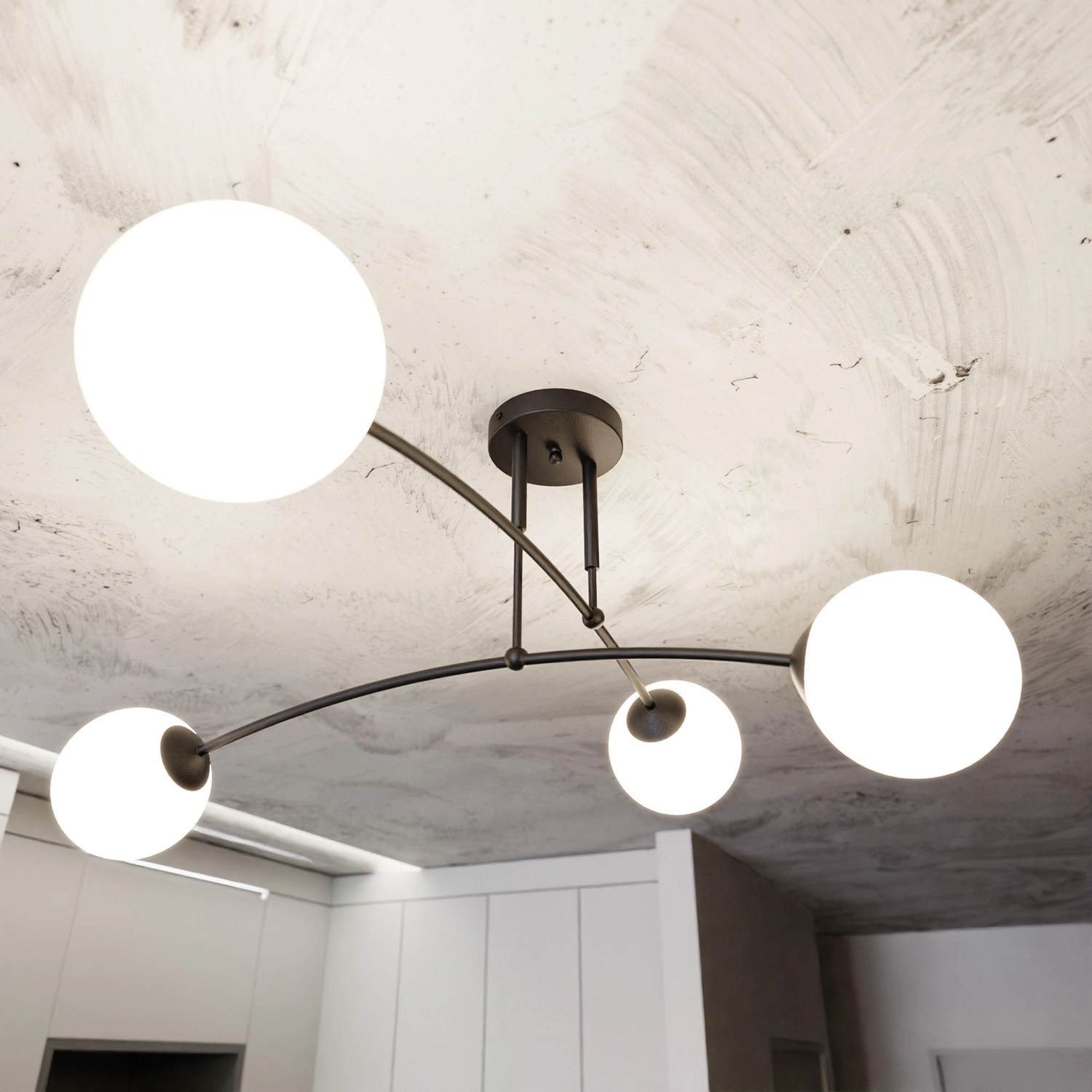 Plafoniera moderna 4 luci Susanoo in acciaio nero e vetri a sfera in bianco emibig 670/4