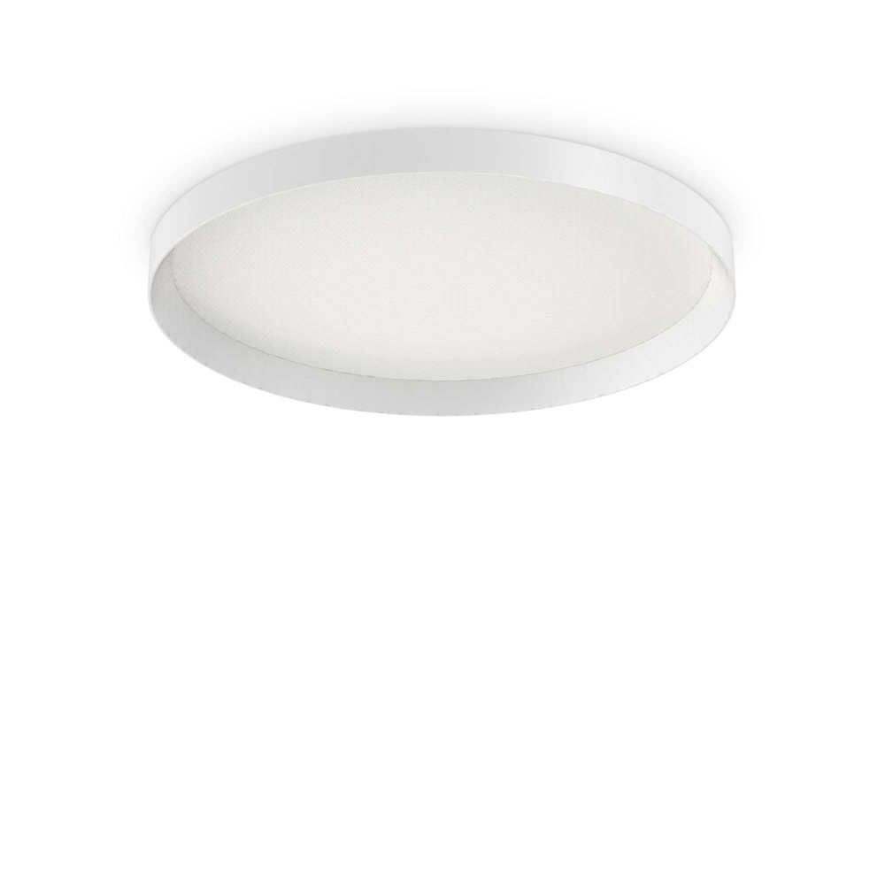 Plafoniera con base circolare diam.60 cm luce Led 50 W.. Corpo luce in alluminio verniciato a polveri in finitura bianco RAL 9016, ottica arretrata con diffusore in PMMA microprismatizzato con controllo dell'abbagliamento.