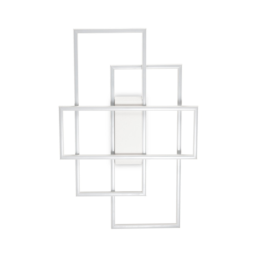 Plafoniera che riproduce 3 rettangoli che si incrociano con base e montatura in metallo verniciato bianco opaco. Diffusori in materiale plastico colore opale.. Emissione luce diretta Led 31 W 3000K (tono caldo).