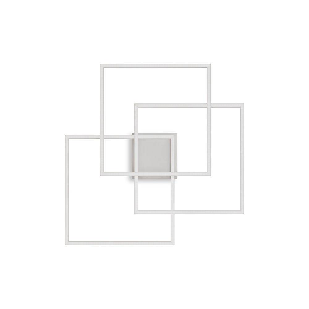 Plafoniera che riproduce 3 quadrati che si incrociano con base e montatura in metallo verniciato bianco opaco.. Diffusori in materiale plastico colore opale. Emissione luce diretta Led 35 W 3000K (gradazione calda).