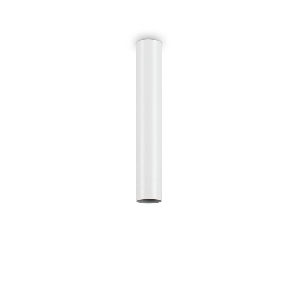 Plafoniera con base di fissaggio in alluminio tornito h.40 cm luce LED GU10 max 28 W 3000 K (tonalità calda).. Diffusore cilindrico diam. 6 cm in metallo verniciato a polveri bianco.
