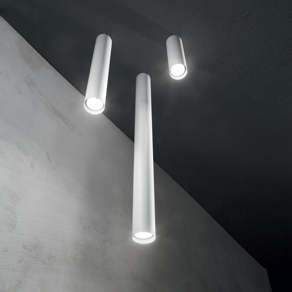 Collezione LOOKTUBI DAL SOFFITTOPlafoniera moderna 1 luce con base di fissaggio in alluminio tornito. Diffusore cilidrico in metallo veriniciato a polveri bianco.. D..
