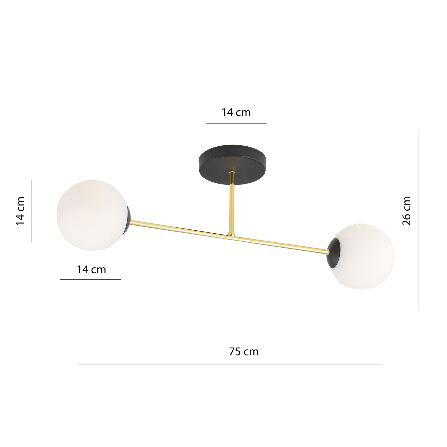 Plafoniera moderna Magnium 2 luci in acciao nero oro e sfere in vetro bianco emibig 1233/2