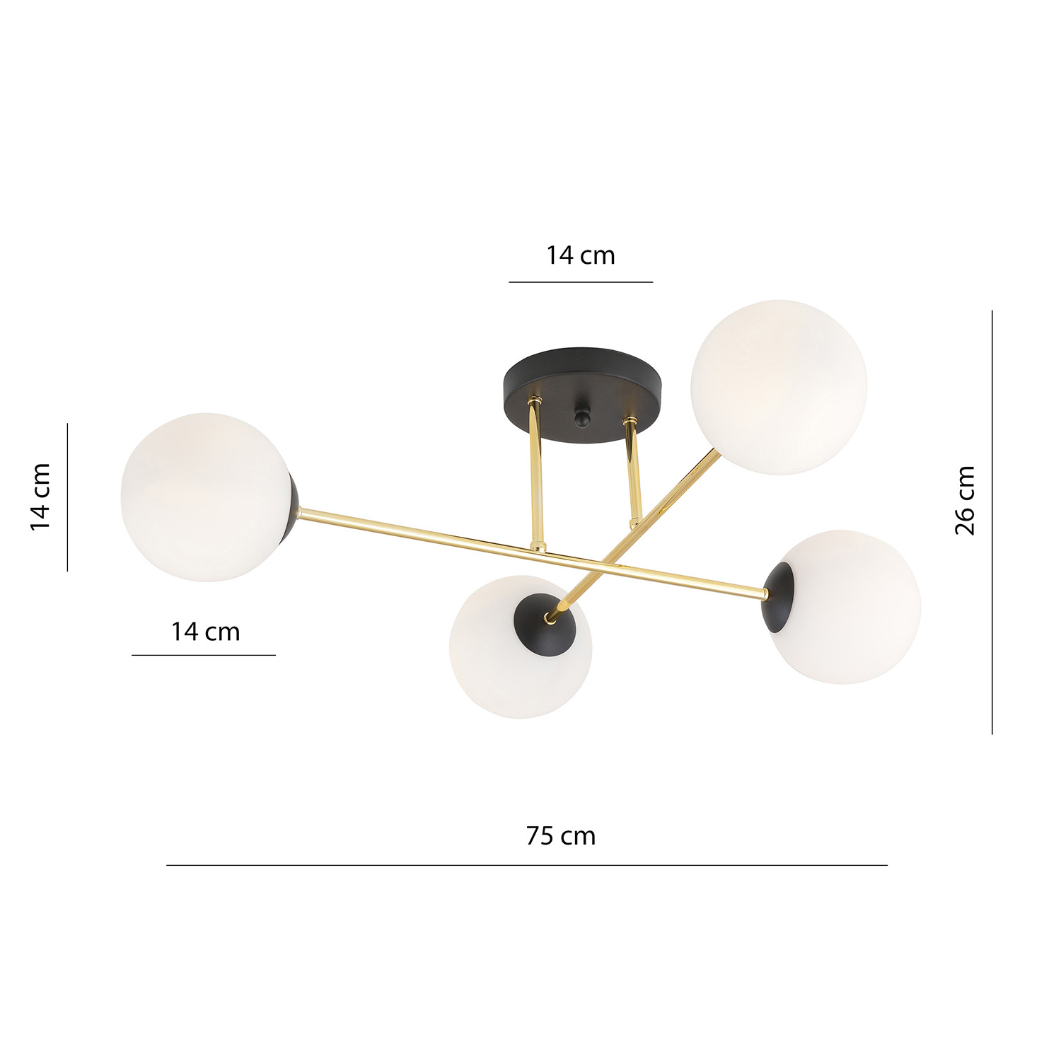Plafoniera contemporanea con rosone e dettagli in acciaio nero e struttura a bracci in acciaio oro completata da 4 diffusori in vetro bianco. I paralumi in vetro e la cornice dorata creano una composizione armoniosa che piace alla vista. Un prodotto di alta qualità, che garantisce durata nel tempo per gli anni a venire.