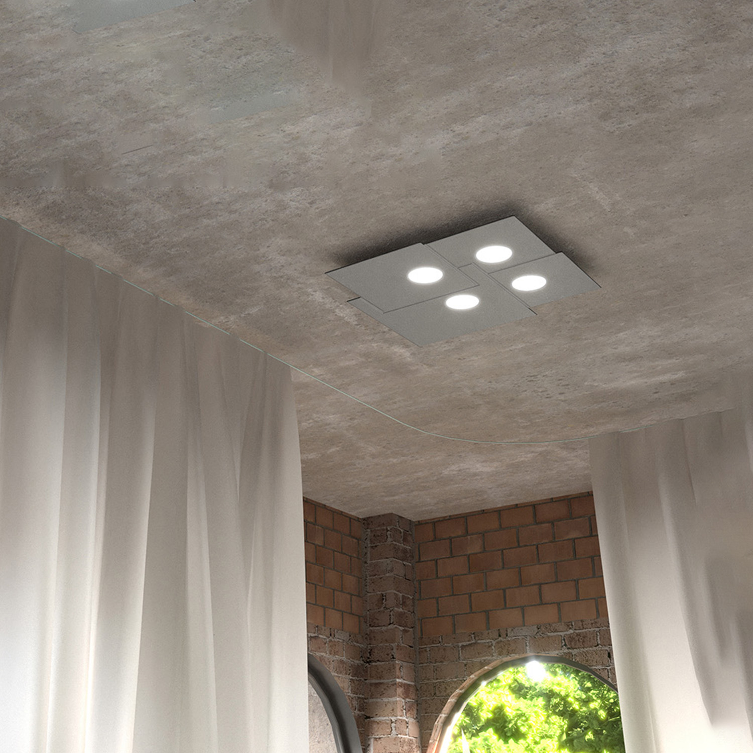 Collezione PLATEUN'ILLUMINAZIONE SENZA LIMITI, UN DESIGN SENZA COMPROMESSIApplique 4 luci biemissione di finitura grigio, realizzata con lastre quadrate di metallo s..