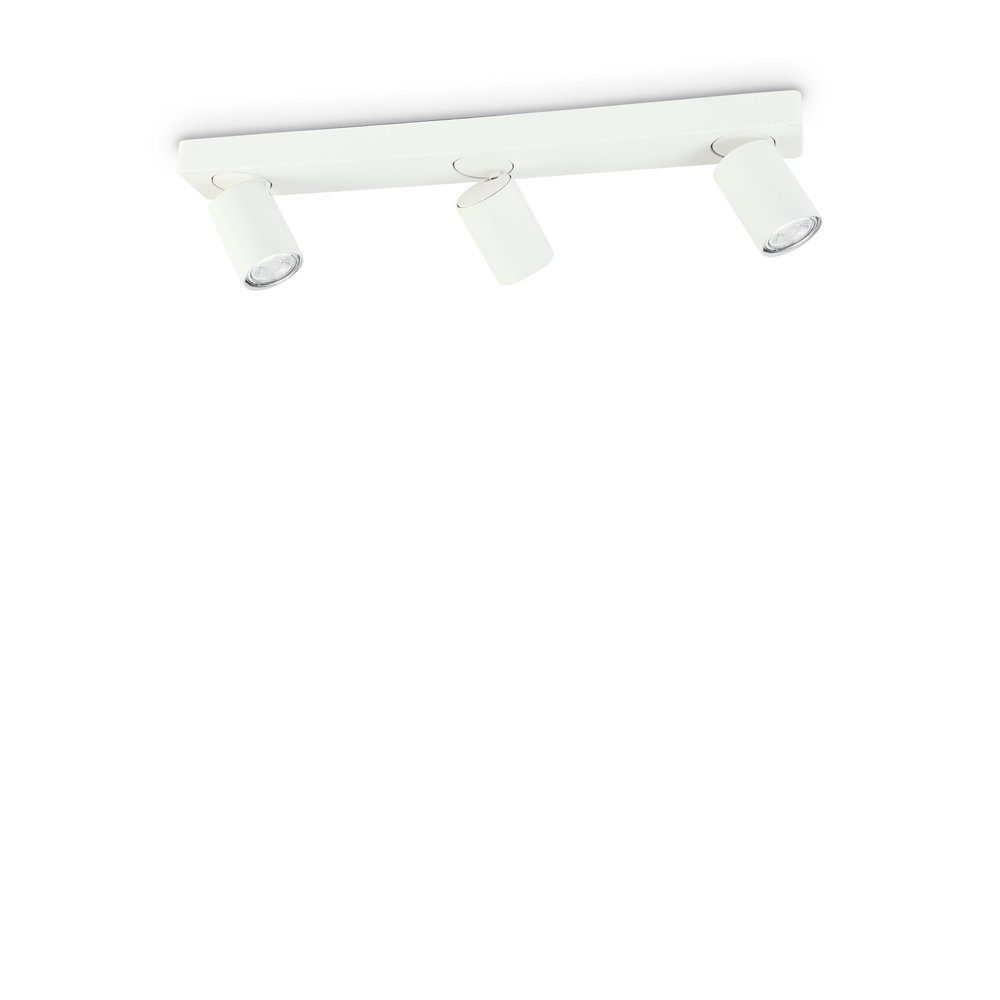 Plafoniera con 3 diffusori 6,5 cm disposti su barra di 53,5 cm in alluminio pressofuso verniciato a polveri bianco.. Diffusori orientabili in rotazione e inclinazione. Lampadine LED GU10 5W 3000 K incluse.
