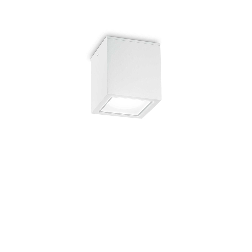 Plafoniera per esterno a forma di cubo 9x9 cm. Corpo luce in alluminio pressofuso verniciato a polveri finitura bianco.. Diffusore in vetro temperato trasparente smerigliato. Attacco GU10 max 20 W.