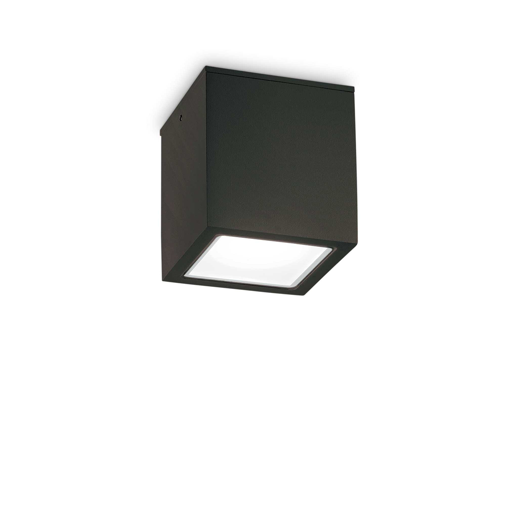 Plafoniera per esterno a forma di cubo 15x15 cm. Corpo luce in alluminio pressofuso verniciato a polveri con finitura nero.. Diffusore in vetro temperato trasparente smerigliato. Attacco GU10 max 20 W.